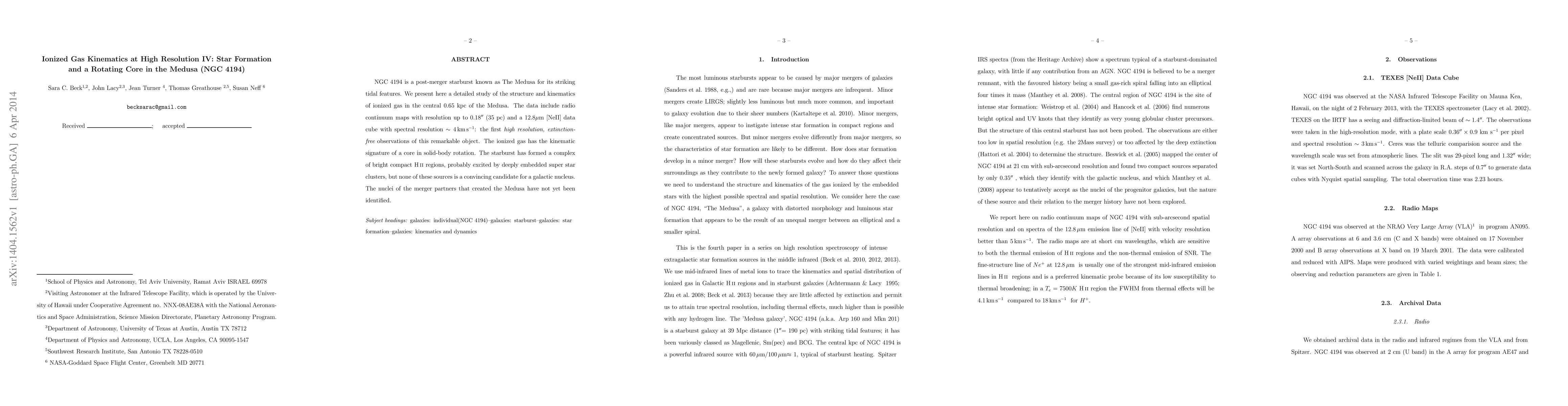 NGC 4194 is a post-merger starburst known as The Medusa for its striking tidal features. We present here a detailed study of the structure and kinematics of ionized gas in the central 0.65 kpc of the Medusa. The data include radio continuum maps with resolution up to $0.18\arcsec$ (35 pc) and a $12.8\mu$m [NeII] data cube with spectral resolution $\sim4$\kms: the first {\it high resolution, extinction-free} observations of this remarkable object. The ionized gas has the kinematic signature of a core in solid-body rotation. The starburst has formed a complex of bright compact \HII~regions, probably excited by deeply embedded super star clusters, but none of these sources is a convincing candidate for a galactic nucleus. The nuclei of the merger partners that created the Medusa have not yet been identified.