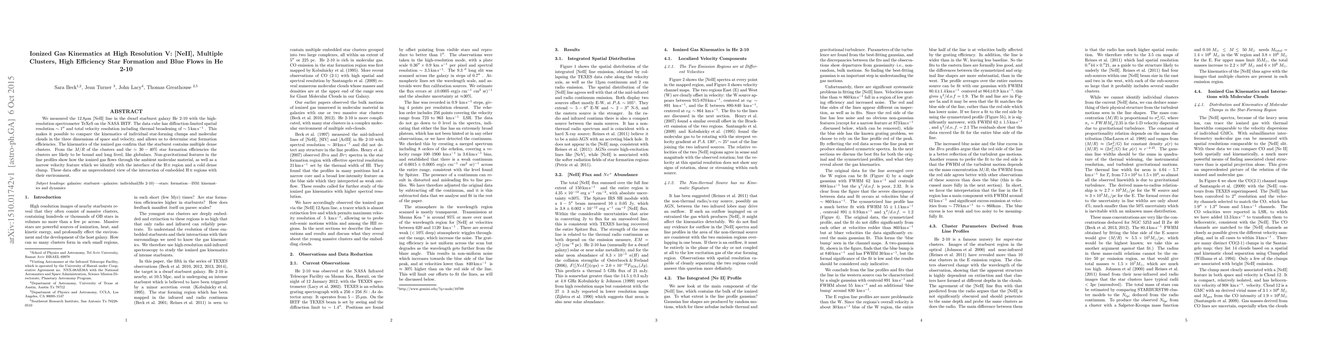 We measured the $12.8\mu$m [NeII] line in the dwarf starburst galaxy He 2-10 with the high-resolution spectrometer TeXeS on the NASA IRTF. The data cube has diffraction-limited spatial resolution $\sim1^{\prime\prime}$ and total velocity resolution including thermal broadening of $\sim5$km/s. This makes it possible to compare the kinematics of individual star-forming clumps and molecular clouds in the three dimensions of space and velocity, and allows us to determine star formation efficiencies. The kinematics of the ionized gas confirm that the starburst contains multiple dense clusters. From the $M/R$ of the clusters and the $\simeq30-40$% star formation efficiencies the clusters are likely to be bound and long lived, like globulars. Non-gravitational features in the line profiles show how the ionized gas flows through the ambient molecular material, as well as a narrow velocity feature which we identify with the interface of the HII region and a cold dense clump. These data offer an unprecedented view of the interaction of embedded HII regions with their environment.
