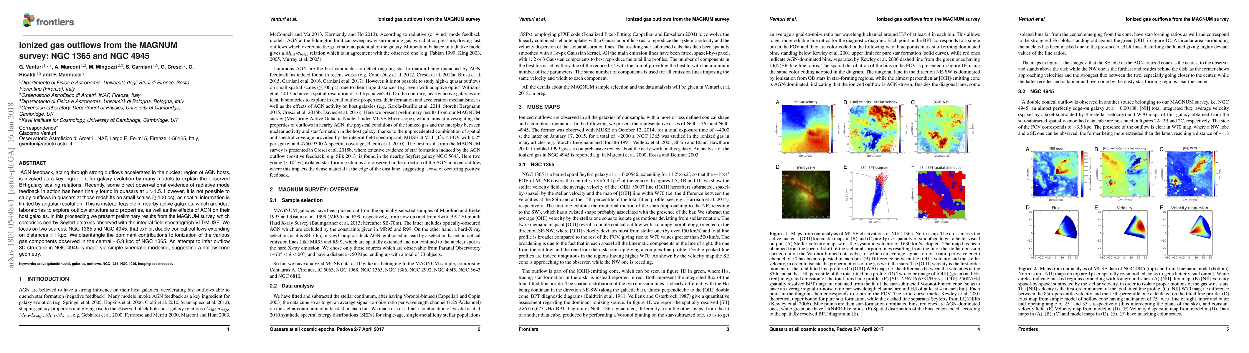This study uses a spectrograph to analyze outflows from two nearby galaxies, NGC 1365 and NGC 4945, revealing double conical structures that provide insights into AGN feedback's role in galaxy evolution.