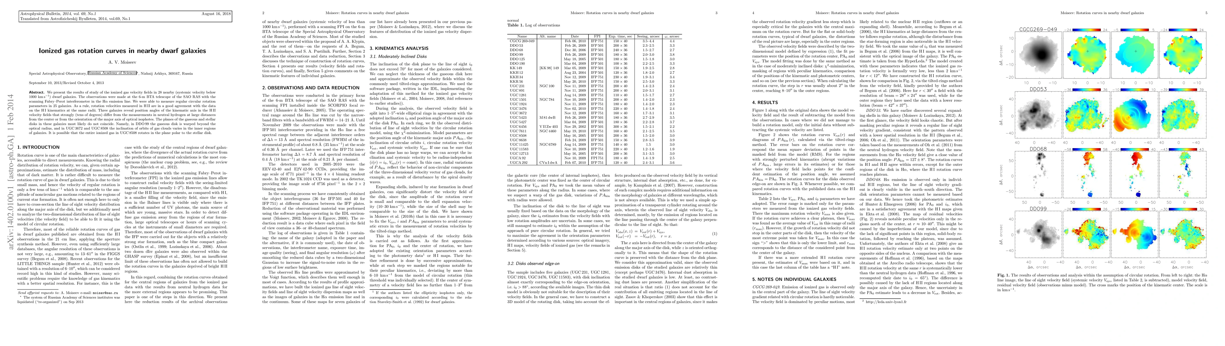 We present the results of study of the ionized gas velocity fields in 28 nearby (systemic velocity below 1000 km/s) dwarf galaxies. The observations were made at the 6-m BTA telescope of the SAO RAS with the scanning Fabry-Perot interferometer in the H-alpha emission line. We were able to measure regular circular rotation parameters in 25 galaxies. As a rule, rotation velocities measured in HII are in a good agreement with the data on the HI kinematics at the same radii. Three galaxies reveal position angles of the kinematic axis in the HII velocity fields that strongly (tens of degrees) differ from the measurements in neutral hydrogen at large distances from the center or from the orientation of the major axis of optical isophotes. The planes of the gaseous and stellar disks in these galaxies most likely do not coincide. Namely, in DDO 99 the gaseous disk is warped beyond the optical radius, and in UGC 3672 and UGC 8508 the inclination of orbits of gas clouds varies in the inner regions of galaxies. It is possible that the entire ionized gas in UGC 8508 rotates in the plane polar to the stellar disk.