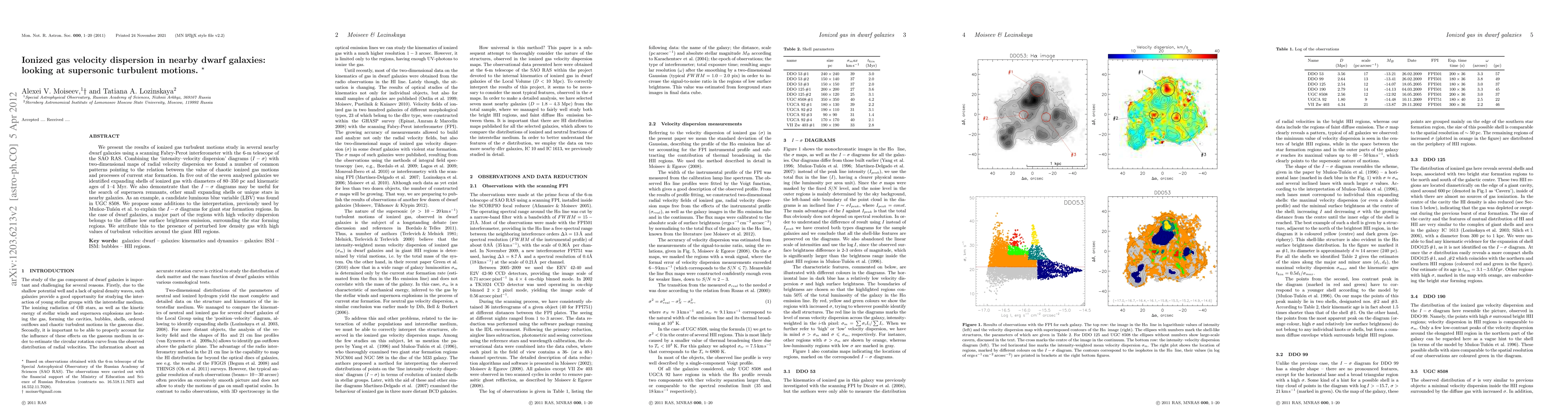 This study investigates ionized gas turbulent motions in nearby dwarf galaxies using a Fabry-Perot interferometer, revealing a correlation between chaotic gas motions and current star formation processes. The research identifies expanding shells of ionized gas and suggests the utility of I-sigma diagrams for detecting supernova remnants and other phenomena.