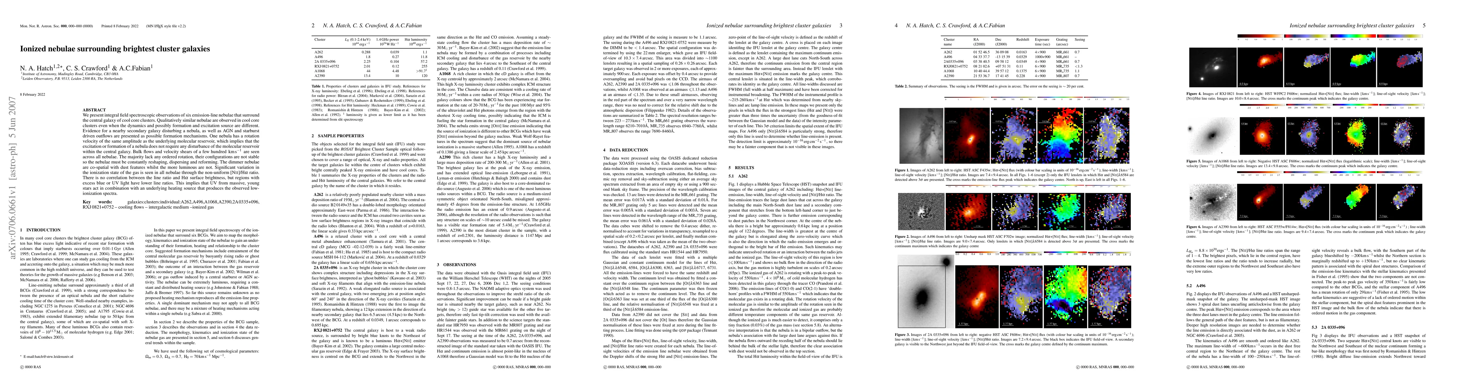 We present IFU observations of six emission-line nebulae that surround the central galaxy of cool core clusters. Qualitatively similar nebulae are observed in cool core clusters even when the dynamics and possibly formation and excitation source are different. Evidence for a nearby secondary galaxy disturbing a nebula, as well as AGN and starburst driven outflows are presented as possible formation mechanisms. One nebula has a rotation velocity of the same amplitude as the underlying molecular reservoir, which implies that the excitation or formation of a nebula does not require any disturbance of the molecular reservoir within the central galaxy. Bulk flows and velocity shears of a few hundred km/s are seen across all nebulae. The majority lack any ordered rotation, their configurations are not stable so the nebulae must be constantly reshaping, dispersing and reforming. The dimmer nebulae are co-spatial with dust features whilst the more luminous are not. Significant variation in the ionization state of the gas is seen in all nebulae through the non-uniform [NII]/H_alpha ratio. There is no correlation between the line ratio and H_alpha surface brightness, but regions with excess blue or UV light have lower line ratios. This implies that UV from massive, young stars act in combination with an underlying heating source that produces the observed low-ionization spectra.
