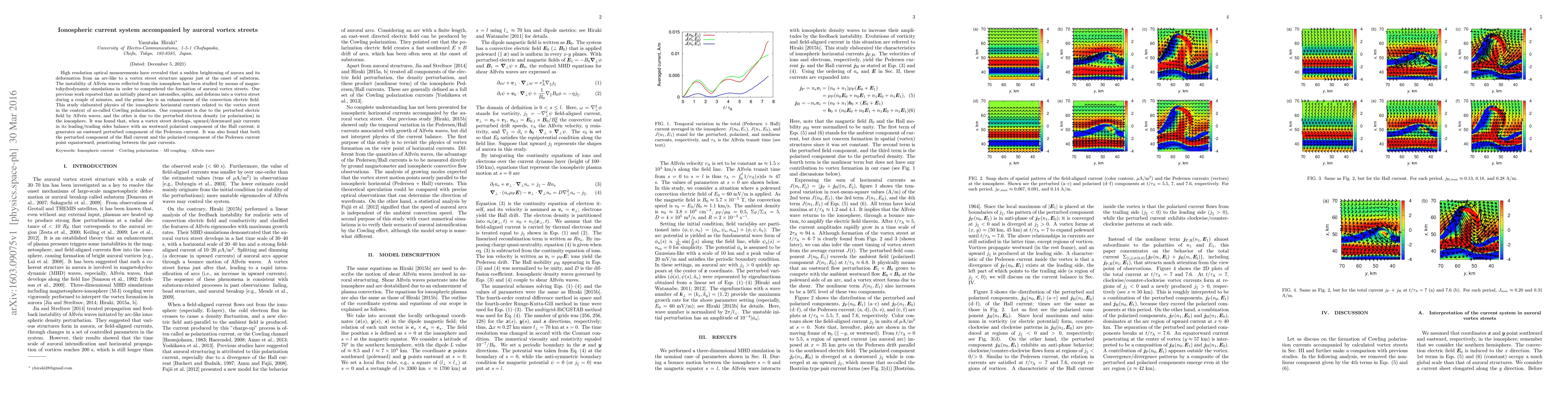 Researchers found that ionospheric currents contribute to auroral vortex street formation through two mechanisms: a perturbed electric field from Alfv$ u$en waves and a perturbation in the ionosphere's electron density. These findings provide new insights into substorm dynamics and aurora physics.