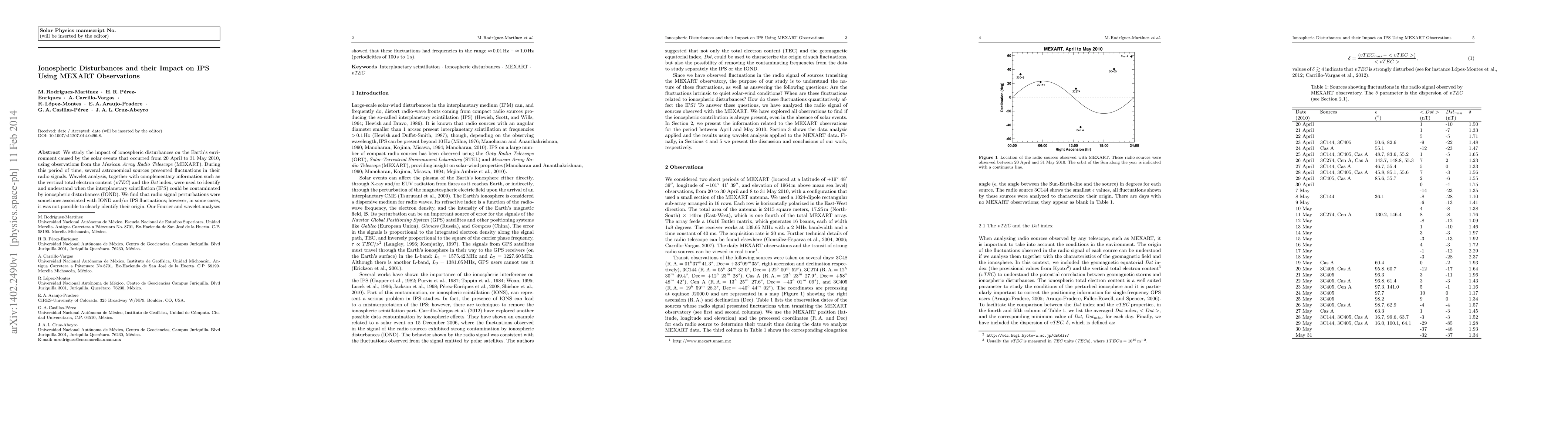 This study investigates ionospheric disturbances' effects on Earth's environment during solar events from April to May 2010, using MEXART observations. It finds that ionospheric disturbances sometimes cause fluctuations in radio signals, impacting interplanetary scintillation, with identified frequencies ranging from 0.01 Hz to 1.0 Hz.