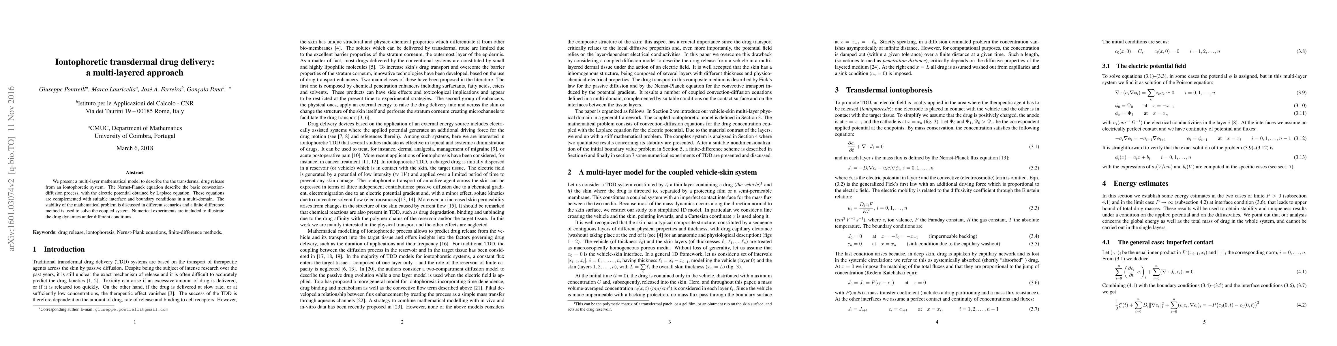 This paper develops a multi-layer mathematical model to simulate iontophoretic transdermal drug delivery, using the Nernst-Planck and Laplace equations to describe the underlying processes. Numerical simulations demonstrate the model's stability and effectiveness in predicting drug dynamics.
