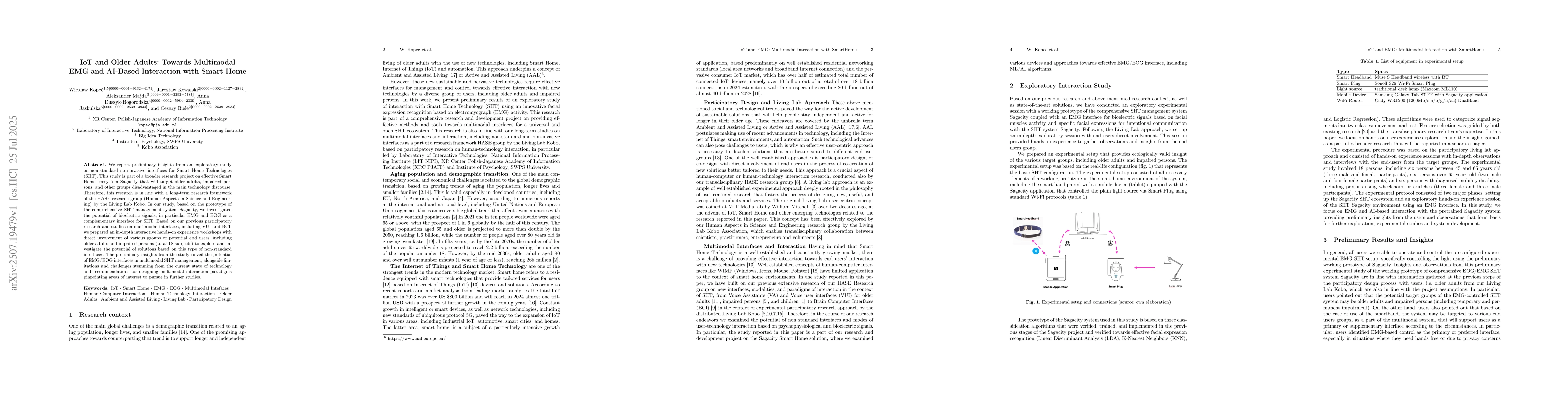 We report preliminary insights from an exploratory study on non-standard non-invasive interfaces for Smart Home Technologies (SHT). This study is part of a broader research project on effective Smart Home ecosystem Sagacity that will target older adults, impaired persons, and other groups disadvantaged in the main technology discourse. Therefore, this research is in line with a long-term research framework of the HASE research group (Human Aspects in Science and Engineering) by the Living Lab Kobo. In our study, based on the prototype of the comprehensive SHT management system Sagacity, we investigated the potential of bioelectric signals, in particular EMG and EOG as a complementary interface for SHT. Based on our previous participatory research and studies on multimodal interfaces, including VUI and BCI, we prepared an in-depth interactive hands-on experience workshops with direct involvement of various groups of potential end users, including older adults and impaired persons (total 18 subjects) to explore and investigate the potential of solutions based on this type of non-standard interfaces. The preliminary insights from the study unveil the potential of EMG/EOG interfaces in multimodal SHT management, alongside limitations and challenges stemming from the current state of technology and recommendations for designing multimodal interaction paradigms pinpointing areas of interest to pursue in further studies.