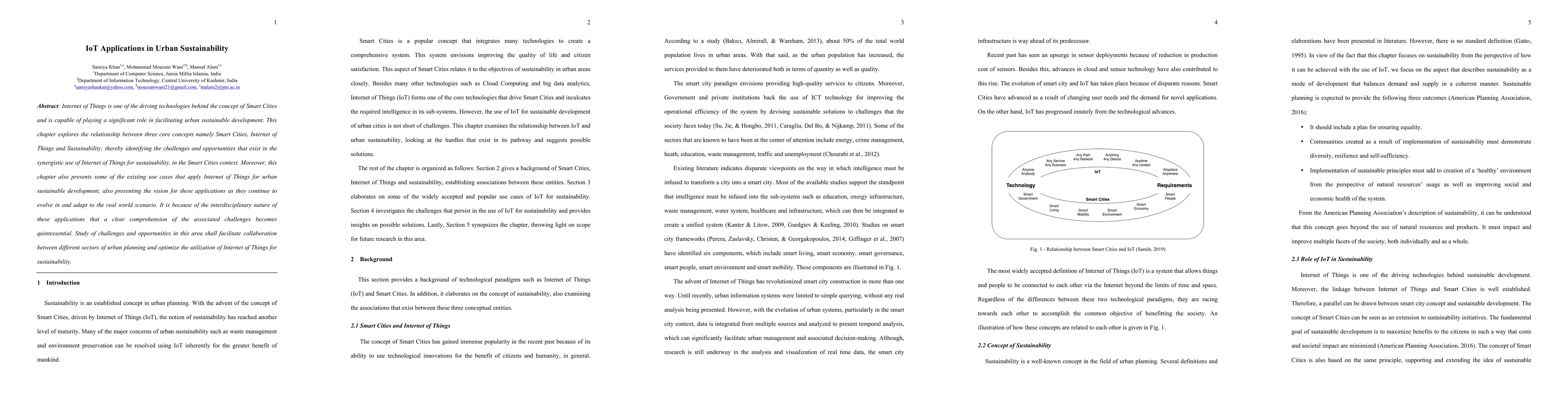 The paper examines the role of IoT in promoting urban sustainability within Smart Cities, identifying key challenges and opportunities. It showcases existing use cases and envisions future applications, emphasizing the need for interdisciplinary collaboration to optimize IoT utilization for sustainability.