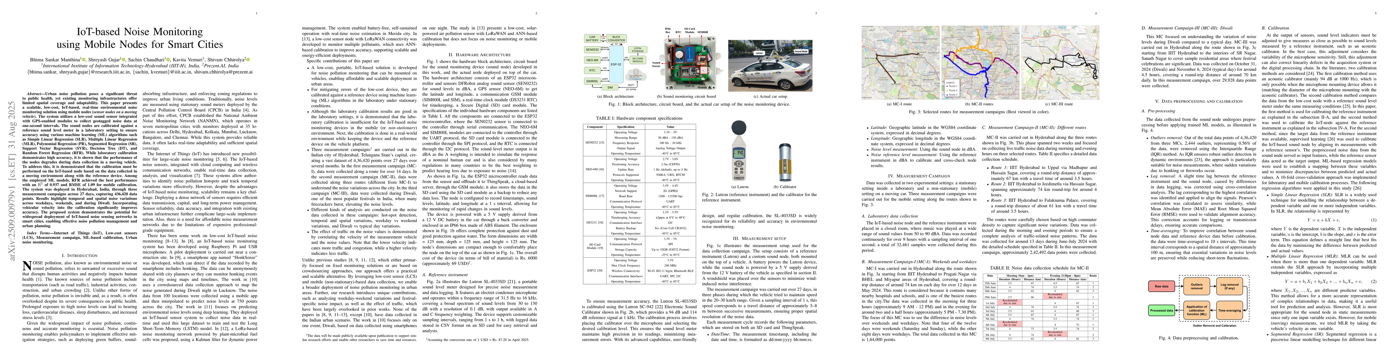 Urban noise pollution poses a significant threat to public health, yet existing monitoring infrastructures offer limited spatial coverage and adaptability. This paper presents a scalable, low-cost, IoT-based, real-time environmental noise monitoring solution using mobile nodes (sensor nodes on a moving vehicle). The system utilizes a low-cost sound sensor integrated with GPS-enabled modules to collect geotagged noise data at one-second intervals. The sound nodes are calibrated against a reference sound level meter in a laboratory setting to ensure accuracy using various machine learning (ML) algorithms, such as Simple Linear Regression (SLR), Multiple Linear Regression (MLR), Polynomial Regression (PR), Segmented Regression (SR), Support Vector Regression (SVR), Decision Tree (DT), and Random Forest Regression (RFR). While laboratory calibration demonstrates high accuracy, it is shown that the performance of the nodes degrades during data collection in a moving vehicle. To address this, it is demonstrated that the calibration must be performed on the IoT-based node based on the data collected in a moving environment along with the reference device. Among the employed ML models, RFR achieved the best performance with an R2 of 0.937 and RMSE of 1.09 for mobile calibration. The system was deployed in Hyderabad, India, through three measurement campaigns across 27 days, capturing 436,420 data points. Results highlight temporal and spatial noise variations across weekdays, weekends, and during Diwali. Incorporating vehicular velocity into the calibration significantly improves accuracy. The proposed system demonstrates the potential for widespread deployment of IoT-based noise sensing networks in smart cities, enabling effective noise pollution management and urban planning.