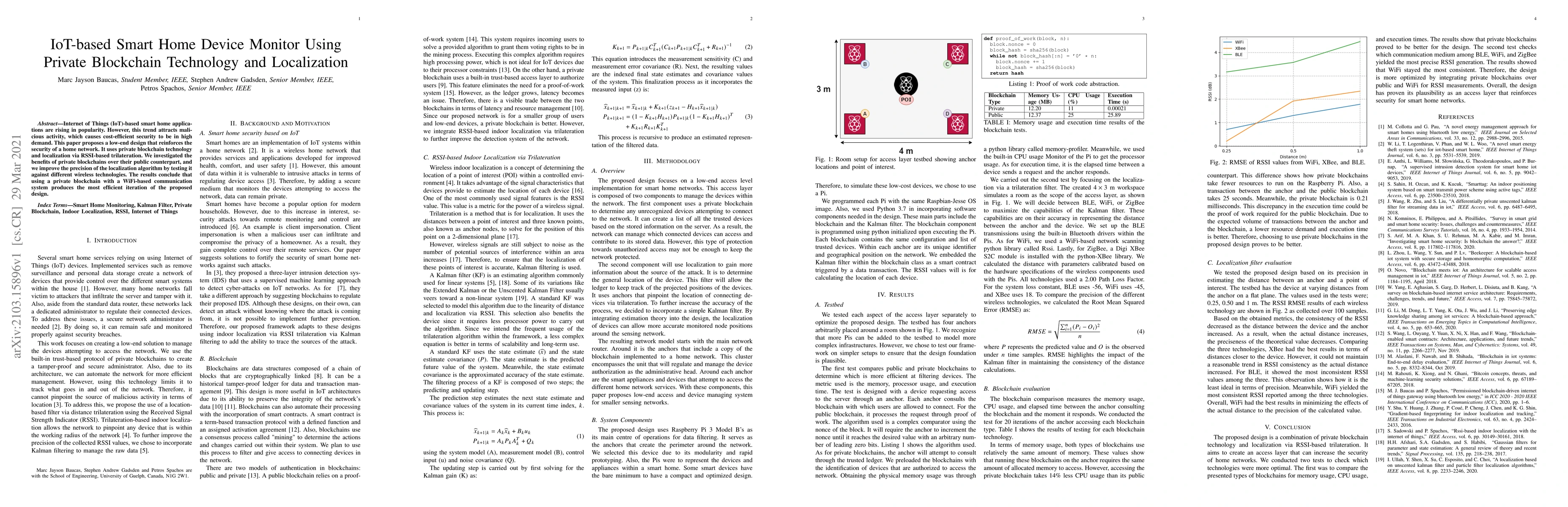 This paper proposes a low-cost smart home security system using private blockchain technology and RSSI-based trilateration for localization. The study finds that a private blockchain with WiFi communication offers the most efficient security and localization accuracy.