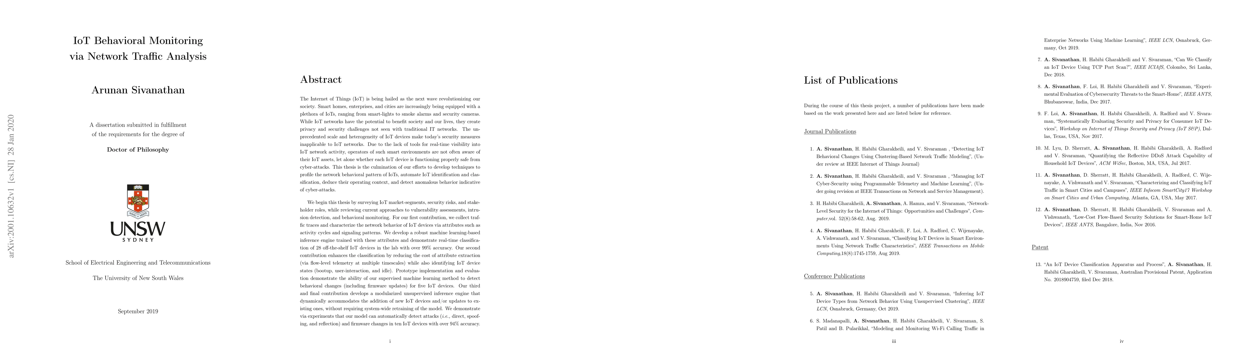 Smart homes, enterprises, and cities are increasingly being equipped with a plethora of Internet of Things (IoT), ranging from smart-lights to security cameras. While IoT networks have the potential to benefit our lives, they create privacy and security challenges not seen with traditional IT networks. Due to the lack of visibility, operators of such smart environments are not often aware of their IoT assets, let alone whether each IoT device is functioning properly safe from cyber-attacks. This thesis is the culmination of our efforts to develop techniques to profile the network behavioral pattern of IoTs, automate IoT classification, deduce their operating context, and detect anomalous behavior indicative of cyber-attacks. We begin this thesis by surveying IoT ecosystem, while reviewing current approaches to vulnerability assessments, intrusion detection, and behavioral monitoring. For our first contribution, we collect traffic traces and characterize the network behavior of IoT devices via attributes from traffic patterns. We develop a robust machine learning-based inference engine trained with these attributes and demonstrate real-time classification of 28 IoT devices with over 99% accuracy. Our second contribution enhances the classification by reducing the cost of attribute extraction while also identifying IoT device states. Prototype implementation and evaluation demonstrate the ability of our supervised machine learning method to detect behavioral changes for five IoT devices. Our third and final contribution develops a modularized unsupervised inference engine that dynamically accommodates the addition of new IoT devices and/or updates to existing ones, without requiring system-wide retraining of the model. We demonstrate via experiments that our model can automatically detect attacks and firmware changes in ten IoT devices with over 94% accuracy.
