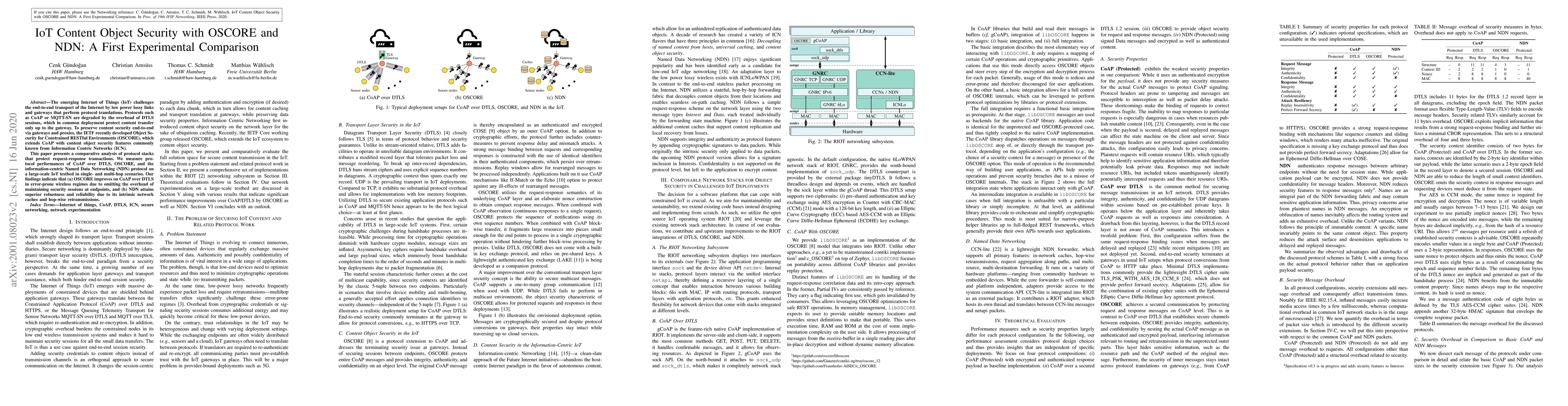 This paper compares the security and performance of CoAP over DTLS, OSCORE, and NDN in IoT environments, finding that OSCORE reduces overhead in wireless conditions, while NDN offers superior robustness and reliability through caching and retransmissions.