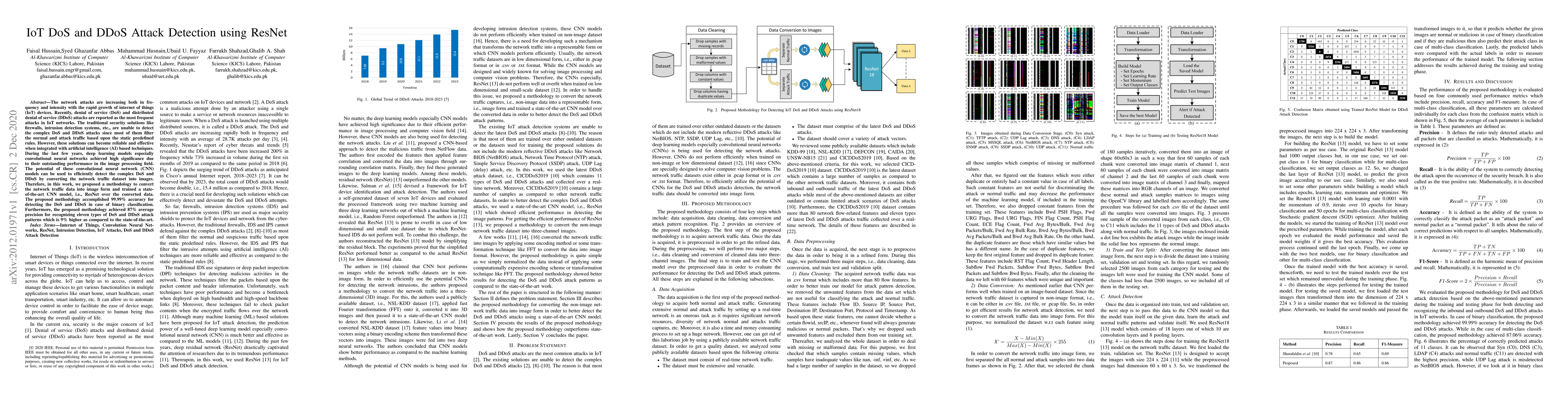 This paper proposes a deep learning-based approach using ResNet to detect DoS and DDoS attacks in IoT networks by converting network traffic data into images. The methodology achieved 99.99% accuracy in binary classification and 87% average precision for recognizing eleven attack types, outperforming existing methods.