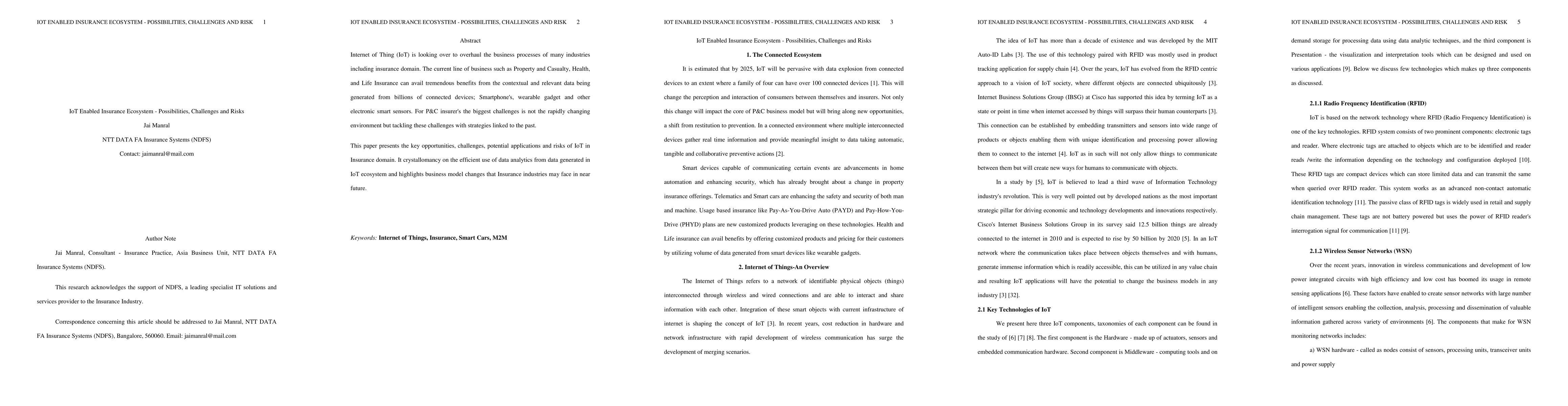 Internet of Thing (IoT) is looking over to overhaul the business processes of many industries including insurance domain. The current line of business such as Property and Casualty, Health, and Life Insurance can avail tremendous benefits from the contextual and relevant data being generated from billions of connected devices; Smartphone's, wearable gadget and other electronic smart sensors. For P&C insurer's the biggest challenges is not the rapidly changing environment but tackling these challenges with strategies linked to the past. This paper presents the key opportunities, challenges, potential applications and risks of IoT in Insurance domain. It crystallomancy on the efficient use of data analytics from data generated in IoT ecosystem and highlights business model changes that Insurance industries may face in near future.