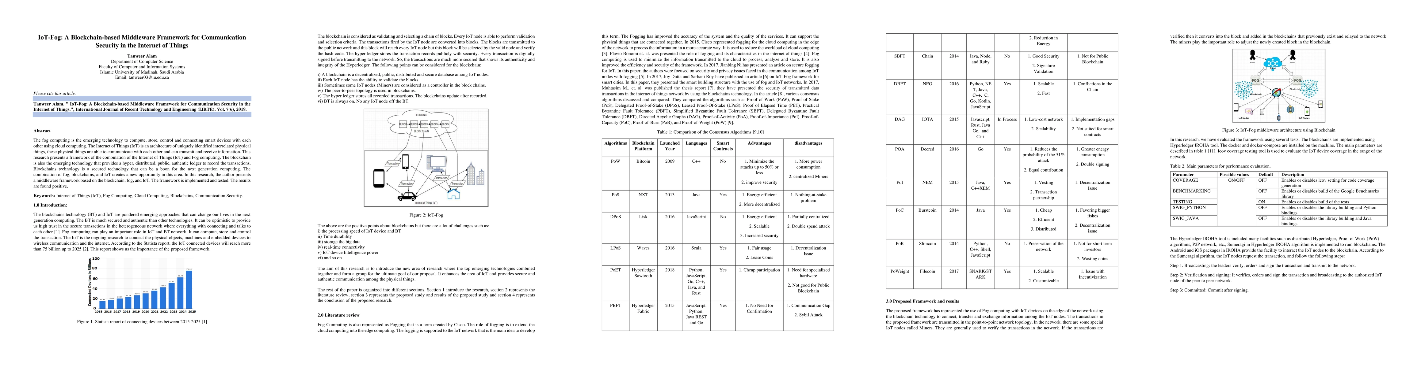 This paper proposes a communication framework combining IoT, Fog computing, and blockchain technology to enhance the secure and efficient management of data in IoT environments. The framework leverages blockchain's distributed ledger for secure transactions and Fog computing to process data closer to IoT devices, reducing latency and bandwidth usage.