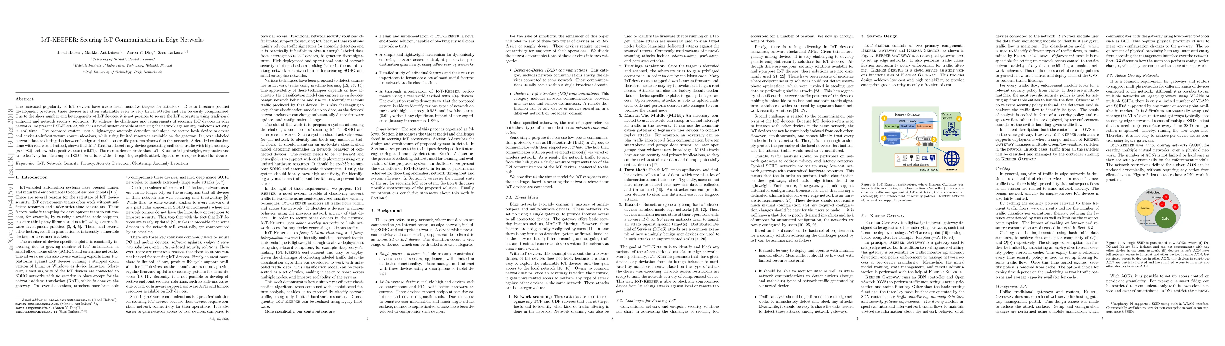 IoT-KEEPER is a novel system designed to secure IoT communications in edge networks by employing a lightweight anomaly detection technique to identify and mitigate malicious activities in real time. It achieves high detection accuracy (0.982) and low false positive rate (0.01) with minimal resource usage on the gateway.