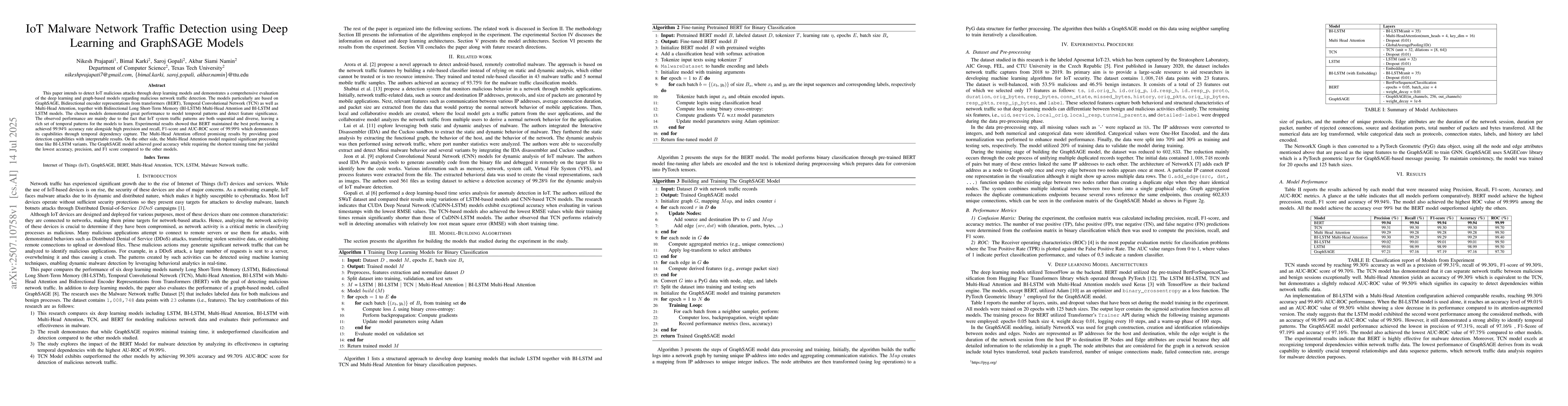 This research compared the performance of graph-based models (GraphSAGE) and deep learning models (BERT, TCN, MultiHeadAttention, BI-LSTM) for identifying malicious network traffic.