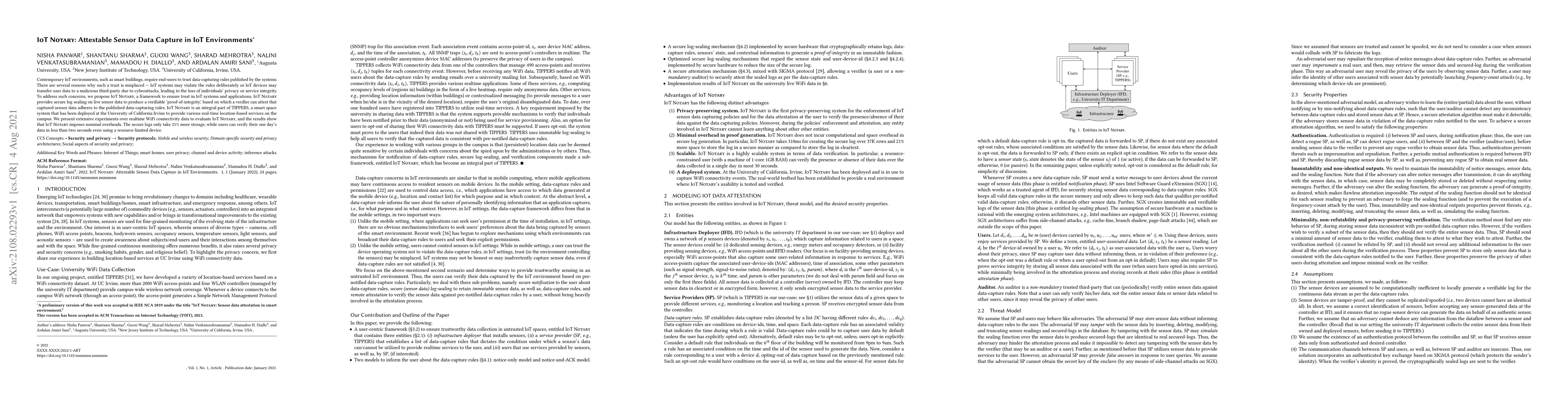 The research paper details IoT Notary, a framework for ensuring trust in IoT systems by providing secure log sealing on live sensor data, producing a verifiable 'proof-of-integrity' based on pre-notified data-capturing rules. The framework was evaluated using real-time WiFi connectivity data from TIPPERS, a smart space system deployed at the University of California Irvine.