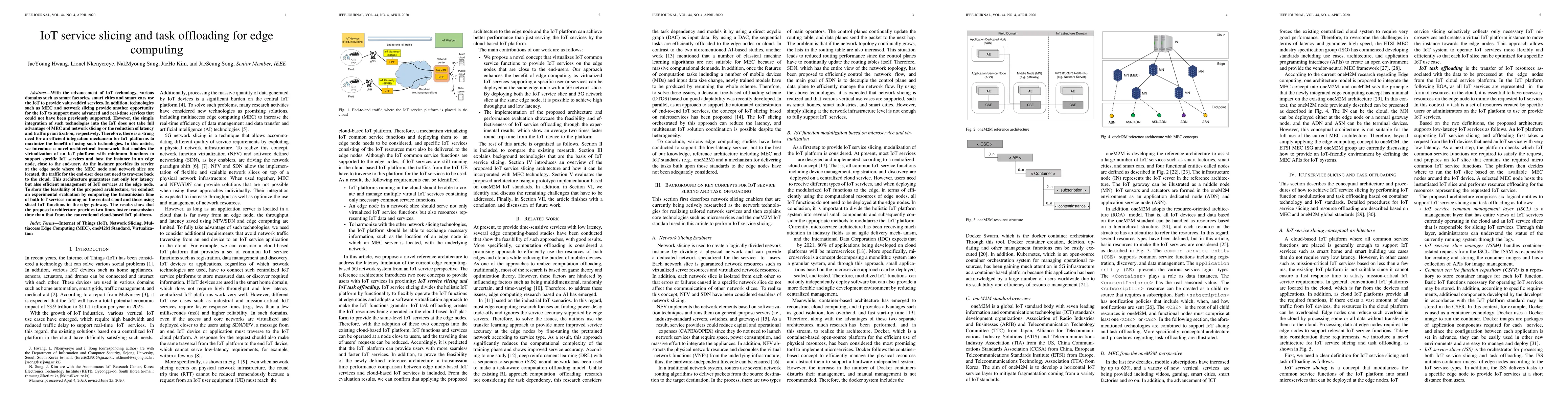 With the advancement of IoT technology, various domains such as smart factories, smart cities and smart cars use the IoT to provide value-added services. In addition, technologies such as MEC and network slicing provide another opportunity for the IoT to support more advanced and real-time services that could not have been previously supported. However, the simple integration of such technologies into the IoT does not take full advantage of MEC and network slicing or the reduction of latency and traffic prioritization, respectively. Therefore, there is a strong need for an efficient integration mechanism for IoT platforms to maximize the benefit of using such technologies. In this article, we introduce a novel architectural framework that enables the virtualization of an IoT platform with minimum functions to support specific IoT services and host the instance in an edge node, close to the end-user. As the instance provides its service at the edge node where the MEC node and network slice are located, the traffic for the end-user does not need to traverse back to the cloud. This architecture guarantees not only low latency but also efficient management of IoT services at the edge node. To show the feasibility of the proposed architecture, we conduct an experimental evaluation by comparing the transmission time of both IoT services running on the central cloud and those using sliced IoT functions in the edge gateway. The results show that the proposed architecture provides two times faster transmission time than that from the conventional cloud-based IoT platform.