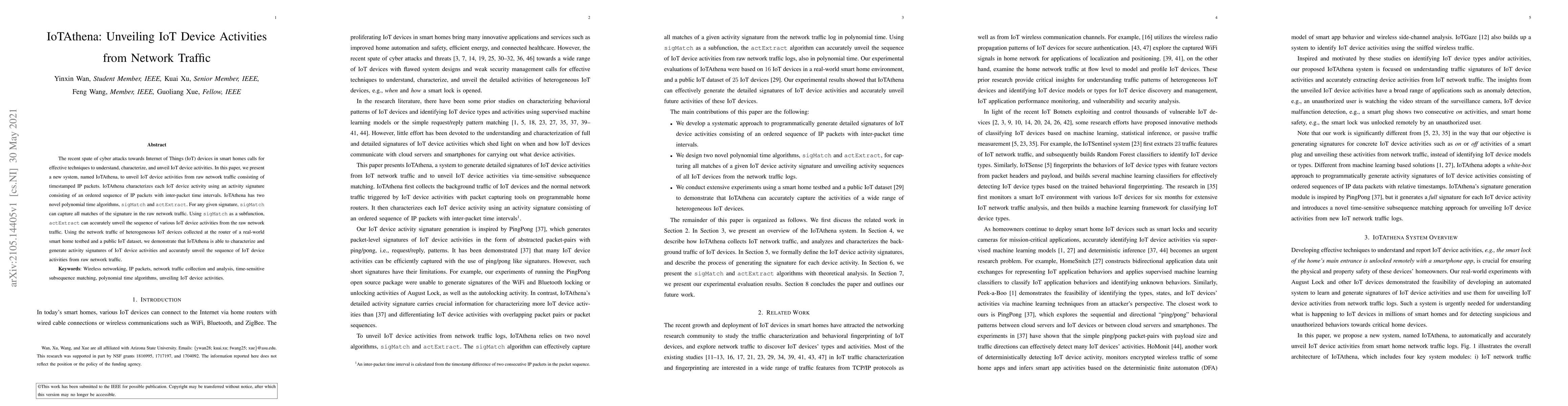 IoTAthena is a novel system designed to unveil IoT device activities from raw network traffic using two polynomial time algorithms, sigMatch and actExtract, to characterize and extract device activity sequences. The system successfully demonstrates its effectiveness in real-world smart home testbeds and public IoT datasets.