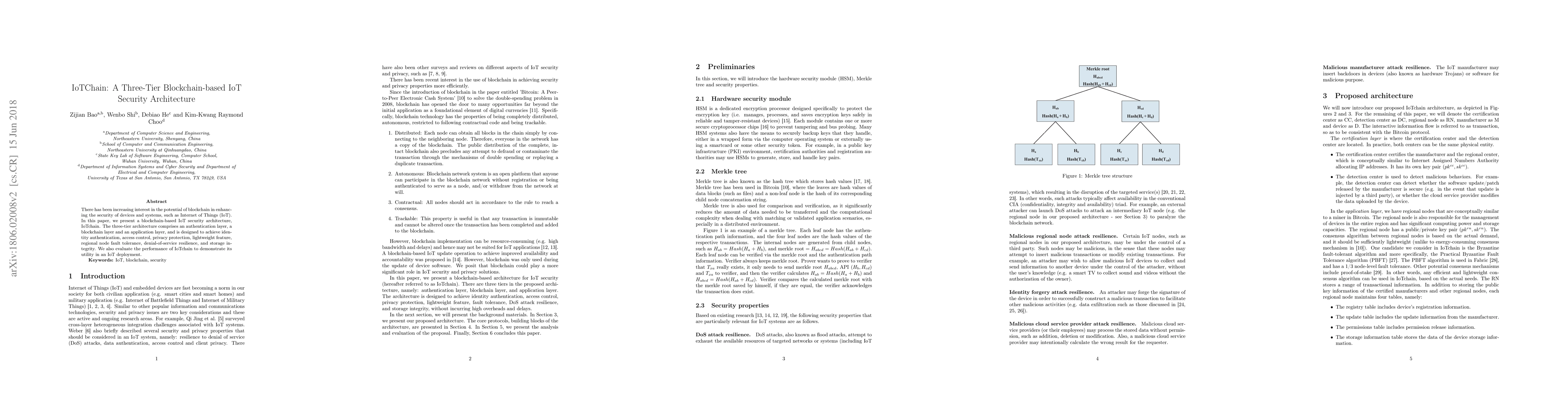 IoTChain is a three-tier blockchain-based security architecture for IoT, designed to enhance identity authentication, access control, and privacy protection while ensuring lightweight operation and resilience against denial-of-service attacks. Performance evaluation demonstrates its practical utility in IoT deployments.