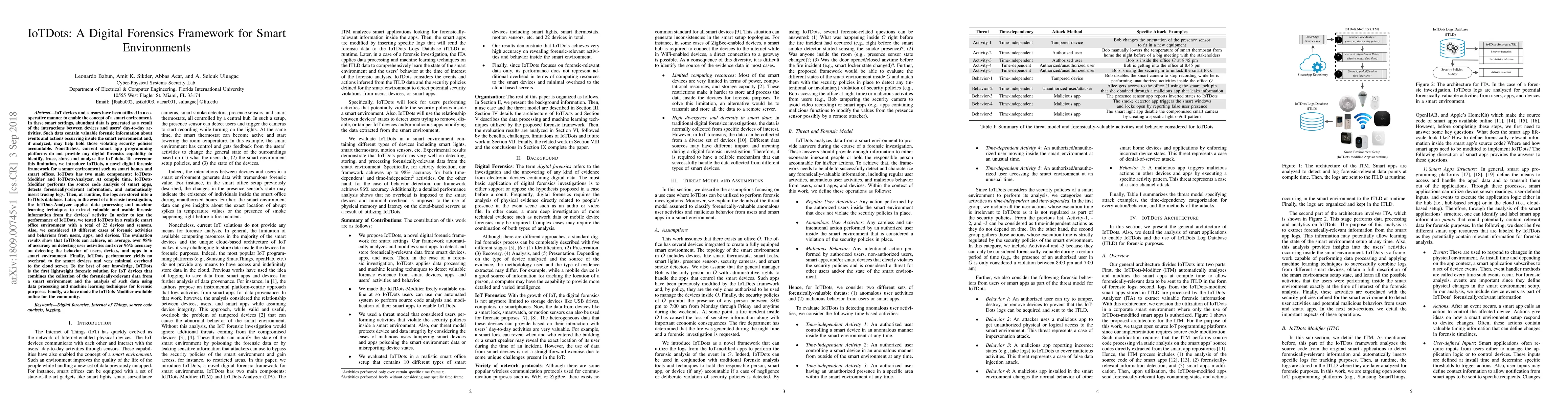 IoTDots is a digital forensic framework that accurately detects user activities and app behavior in smart environments with minimal overhead, achieving 98%+ accuracy in forensic investigations.