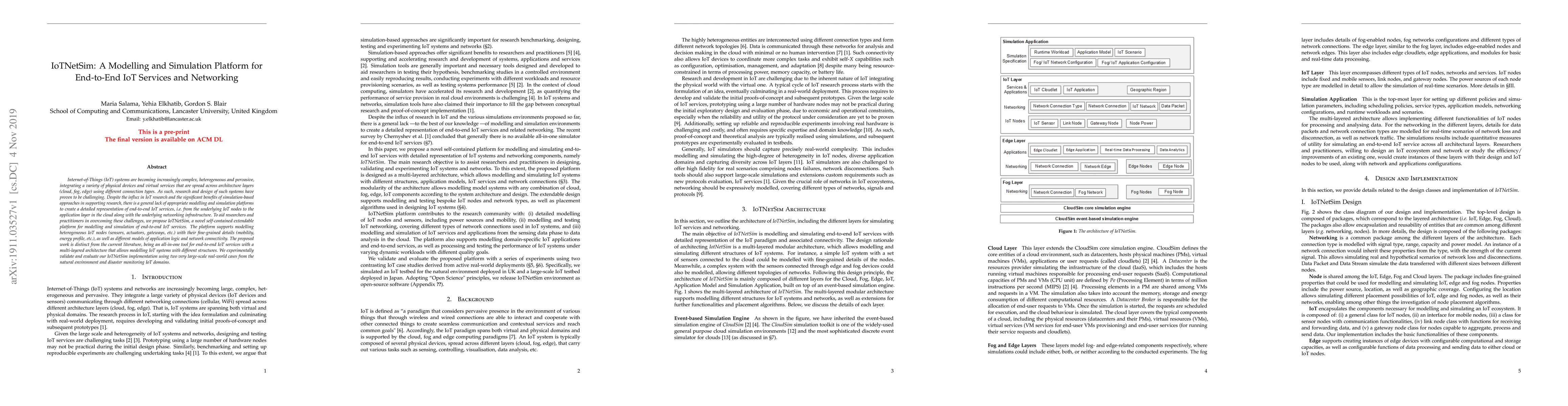 IoTNetSim is a comprehensive modelling and simulation platform designed to facilitate the research and design of complex, heterogeneous IoT systems across cloud, fog, and edge layers. It enables detailed representation of end-to-end IoT services, including fine-grained modelling of IoT nodes and networking infrastructure, and is validated through large-scale real-world applications in natural environment and disaster monitoring.