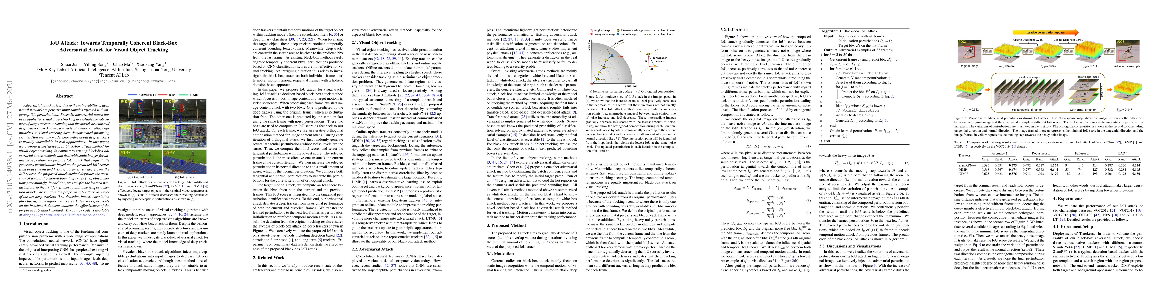 This paper proposes a black-box adversarial attack method called IoU attack for visual object tracking, which generates temporally coherent perturbations based on predicted Intersection over Union (IoU) scores to degrade tracking accuracy over time. The method is validated on various state-of-the-art trackers and shown to be effective through extensive experiments on benchmark datasets.