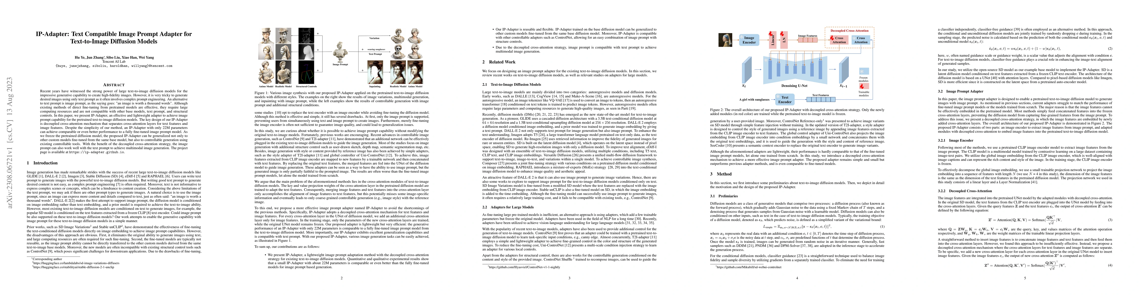 Recent years have witnessed the strong power of large text-to-image diffusion models for the impressive generative capability to create high-fidelity images. However, it is very tricky to generate desired images using only text prompt as it often involves complex prompt engineering. An alternative to text prompt is image prompt, as the saying goes: "an image is worth a thousand words". Although existing methods of direct fine-tuning from pretrained models are effective, they require large computing resources and are not compatible with other base models, text prompt, and structural controls. In this paper, we present IP-Adapter, an effective and lightweight adapter to achieve image prompt capability for the pretrained text-to-image diffusion models. The key design of our IP-Adapter is decoupled cross-attention mechanism that separates cross-attention layers for text features and image features. Despite the simplicity of our method, an IP-Adapter with only 22M parameters can achieve comparable or even better performance to a fully fine-tuned image prompt model. As we freeze the pretrained diffusion model, the proposed IP-Adapter can be generalized not only to other custom models fine-tuned from the same base model, but also to controllable generation using existing controllable tools. With the benefit of the decoupled cross-attention strategy, the image prompt can also work well with the text prompt to achieve multimodal image generation. The project page is available at \url{https://ip-adapter.github.io}.