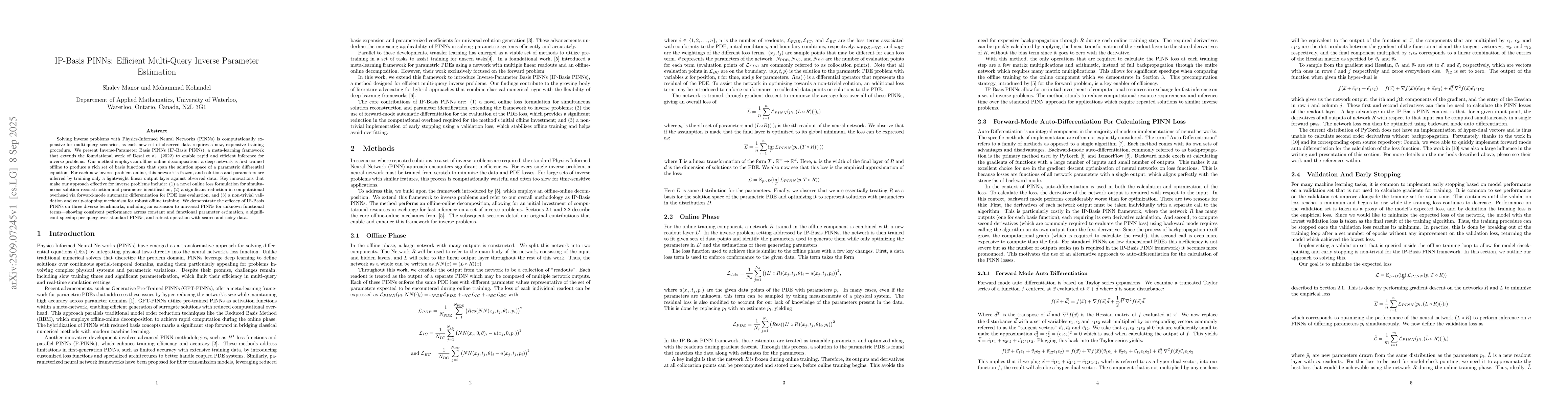 Solving inverse problems with Physics-Informed Neural Networks (PINNs) is computationally expensive for multi-query scenarios, as each new set of observed data requires a new, expensive training procedure. We present Inverse-Parameter Basis PINNs (IP-Basis PINNs), a meta-learning framework that extends the foundational work of Desai et al. (2022) to enable rapid and efficient inference for inverse problems. Our method employs an offline-online decomposition: a deep network is first trained offline to produce a rich set of basis functions that span the solution space of a parametric differential equation. For each new inverse problem online, this network is frozen, and solutions and parameters are inferred by training only a lightweight linear output layer against observed data. Key innovations that make our approach effective for inverse problems include: (1) a novel online loss formulation for simultaneous solution reconstruction and parameter identification, (2) a significant reduction in computational overhead via forward-mode automatic differentiation for PDE loss evaluation, and (3) a non-trivial validation and early-stopping mechanism for robust offline training. We demonstrate the efficacy of IP-Basis PINNs on three diverse benchmarks, including an extension to universal PINNs for unknown functional terms-showing consistent performance across constant and functional parameter estimation, a significant speedup per query over standard PINNs, and robust operation with scarce and noisy data.