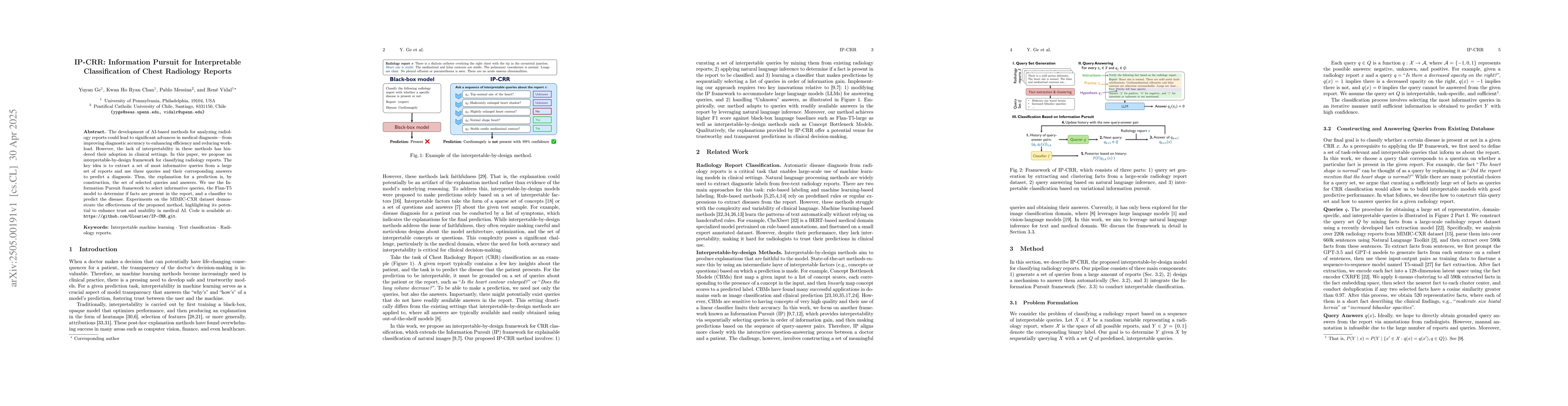 The development of AI-based methods for analyzing radiology reports could lead to significant advances in medical diagnosis--from improving diagnostic accuracy to enhancing efficiency and reducing workload. However, the lack of interpretability in these methods has hindered their adoption in clinical settings. In this paper, we propose an interpretable-by-design framework for classifying radiology reports. The key idea is to extract a set of most informative queries from a large set of reports and use these queries and their corresponding answers to predict a diagnosis. Thus, the explanation for a prediction is, by construction, the set of selected queries and answers. We use the Information Pursuit framework to select informative queries, the Flan-T5 model to determine if facts are present in the report, and a classifier to predict the disease. Experiments on the MIMIC-CXR dataset demonstrate the effectiveness of the proposed method, highlighting its potential to enhance trust and usability in medical AI.