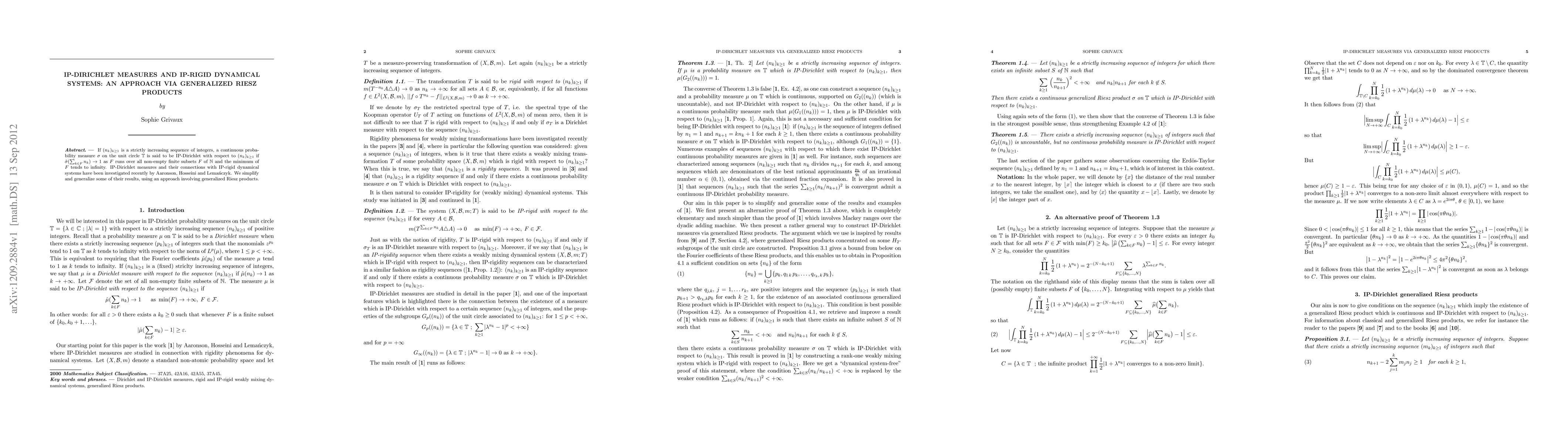 This paper investigates IP-Dirichlet measures, which are probability measures on the unit circle whose Fourier coefficients exhibit specific convergence properties relative to a sequence of integers. The authors simplify and generalize prior results by Aaronson, Hosseini, and Lemańczyk, employing generalized Riesz products to explore connections with IP-rigid dynamical systems.