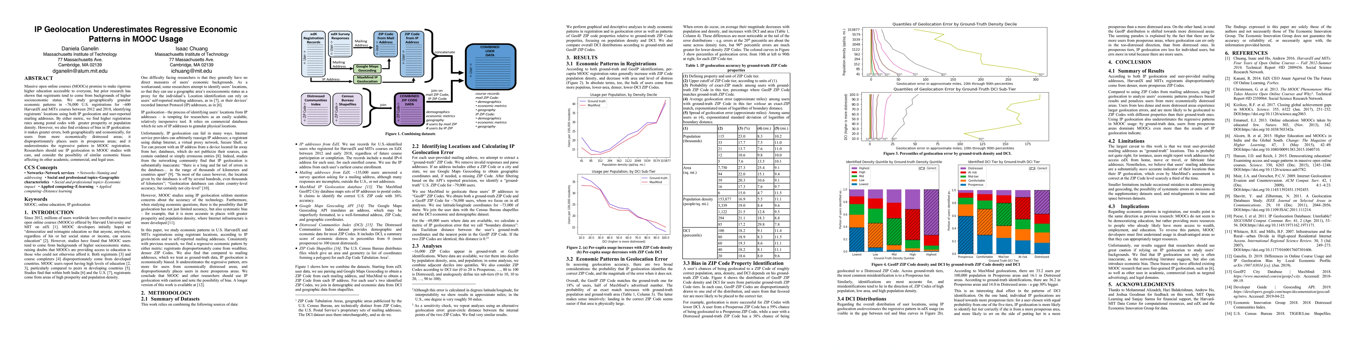 Massive open online courses (MOOCs) promise to make rigorous higher education accessible to everyone, but prior research has shown that registrants tend to come from backgrounds of higher socioeconomic status. We study geographically granular economic patterns in about 76,000 U.S. registrations for about 600 HarvardX and MITx courses between 2012 and 2018, identifying registrants' locations using both IP geolocation and user-reported mailing addresses. By either metric, we find higher registration rates among postal codes with greater prosperity or population density. However, we also find evidence of bias in IP geolocation: it makes greater errors, both geographically and economically, for users from more economically distressed areas; it disproportionately places users in prosperous areas; and it underestimates the regressive pattern in MOOC registration. Researchers should use IP geolocation in MOOC studies with care, and consider the possibility of similar economic biases affecting its other academic, commercial, and legal uses.