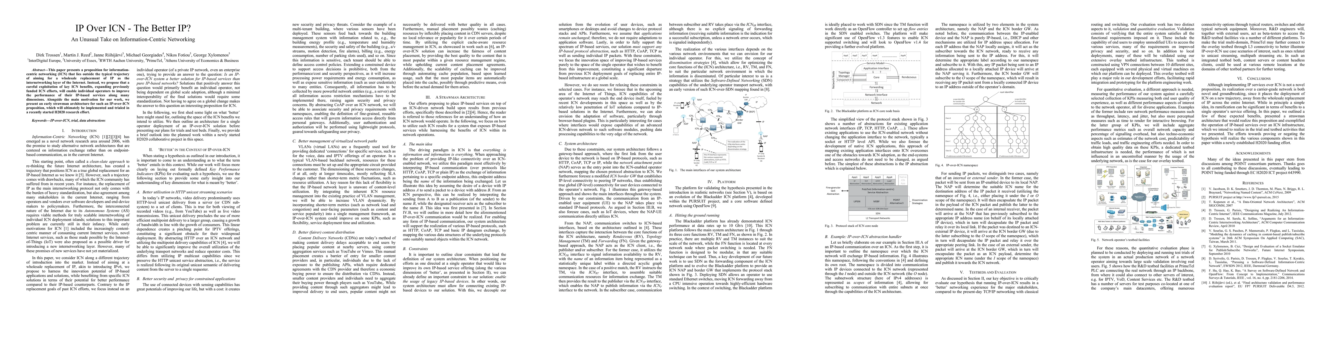 This paper proposes an IP-over-ICN approach to enhance the performance of existing IP-based services without fully replacing IP. It introduces an early architecture for this concept, which will be developed and tested in a new H2020 research initiative.