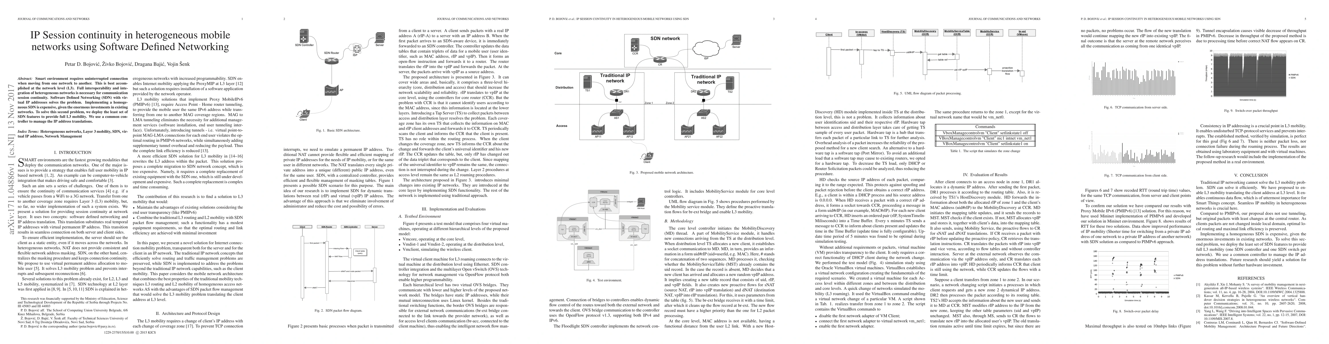 This paper explores maintaining IP session continuity across heterogeneous mobile networks using Software Defined Networking (SDN). It proposes deploying a minimal set of SDN features to achieve Layer 3 mobility and uses a common controller for IP address translation to avoid high costs associated with full SDN implementation.