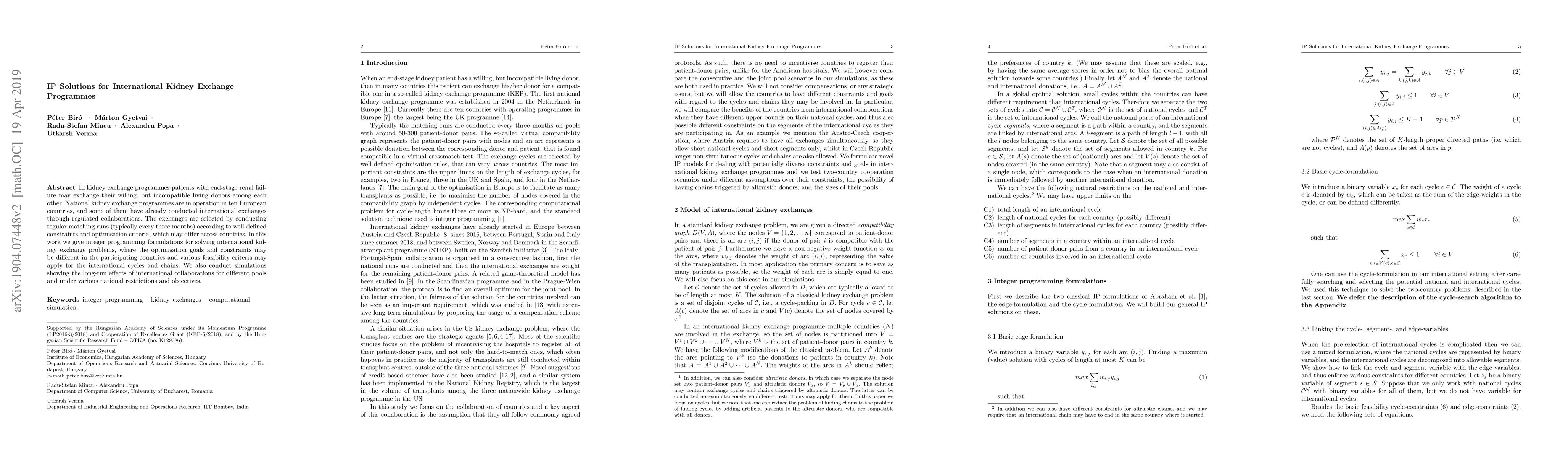 In kidney exchange programmes patients with end-stage renal failure may exchange their willing, but incompatible living donors among each other. National kidney exchange programmes are in operation in ten European countries, and some of them have already conducted international exchanges through regulated collaborations. The exchanges are selected by conducting regular matching runs (typically every three months) according to well-defined constraints and optimisation criteria, which may differ across countries. In this work we give integer programming formulations for solving international kidney exchange problems, where the optimisation goals and constraints may be different in the participating countries and various feasibility criteria may apply for the international cycles and chains. We also conduct simulations showing the long-run effects of international collaborations for different pools and under various national restrictions and objectives.
