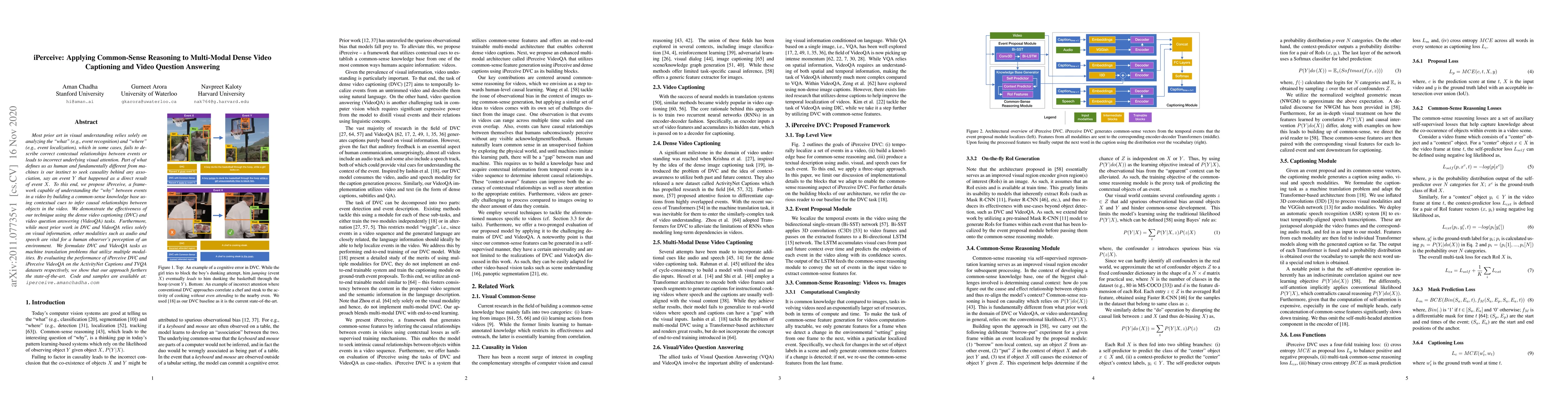 iPerceive is a framework that applies common-sense reasoning to enhance multi-modal dense video captioning and video question answering by inferring causal relationships between events using contextual cues. It outperforms existing methods by integrating visual, audio, and speech modalities, achieving state-of-the-art results on ActivityNet Captions and TVQA datasets.