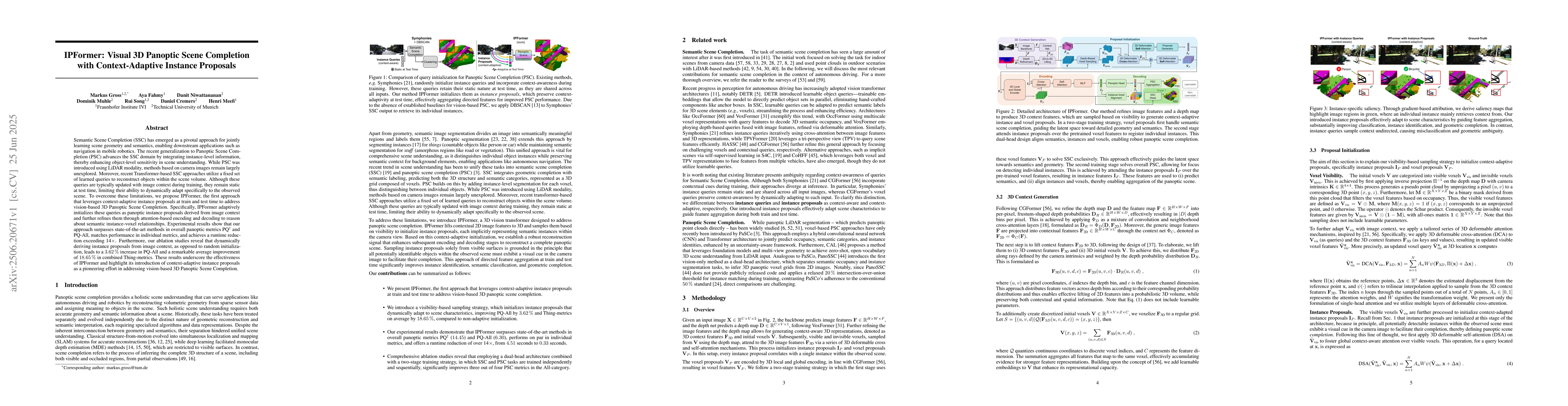Semantic Scene Completion (SSC) has emerged as a pivotal approach for jointly learning scene geometry and semantics, enabling downstream applications such as navigation in mobile robotics. The recent generalization to Panoptic Scene Completion (PSC) advances the SSC domain by integrating instance-level information, thereby enhancing object-level sensitivity in scene understanding. While PSC was introduced using LiDAR modality, methods based on camera images remain largely unexplored. Moreover, recent Transformer-based SSC approaches utilize a fixed set of learned queries to reconstruct objects within the scene volume. Although these queries are typically updated with image context during training, they remain static at test time, limiting their ability to dynamically adapt specifically to the observed scene. To overcome these limitations, we propose IPFormer, the first approach that leverages context-adaptive instance proposals at train and test time to address vision-based 3D Panoptic Scene Completion. Specifically, IPFormer adaptively initializes these queries as panoptic instance proposals derived from image context and further refines them through attention-based encoding and decoding to reason about semantic instance-voxel relationships. Experimental results show that our approach surpasses state-of-the-art methods in overall panoptic metrics PQ$^\dagger$ and PQ-All, matches performance in individual metrics, and achieves a runtime reduction exceeding 14$\times$. Furthermore, our ablation studies reveal that dynamically deriving instance proposals from image context, as opposed to random initialization, leads to a 3.62% increase in PQ-All and a remarkable average improvement of 18.65% in combined Thing-metrics. These results highlight our introduction of context-adaptive instance proposals as a pioneering effort in addressing vision-based 3D Panoptic Scene Completion.