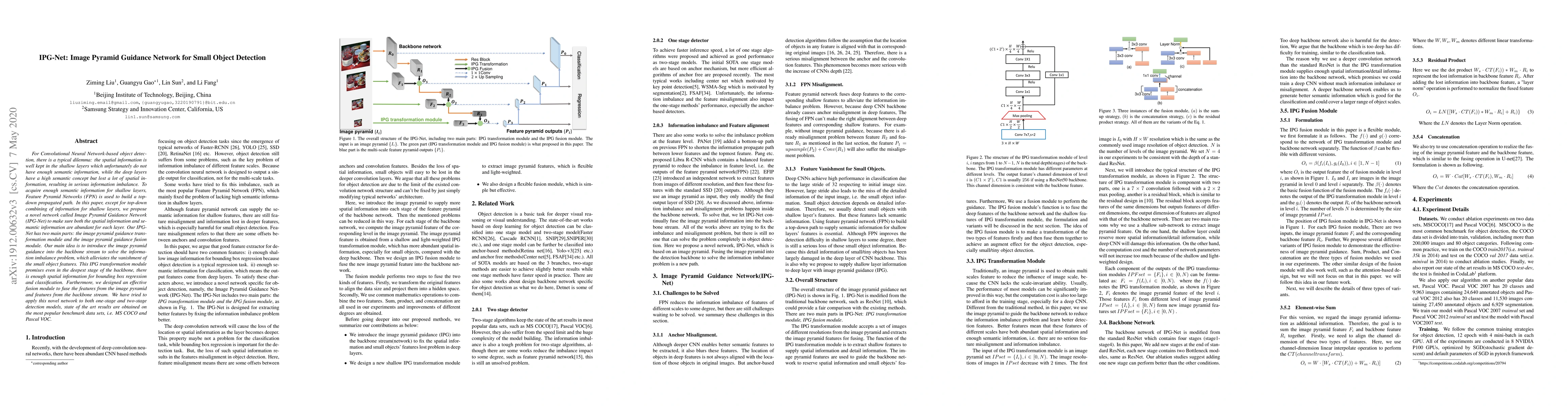 The IPG-Net addresses the information imbalance in CNN-based object detection by integrating an image pyramid guidance transformation and fusion module, ensuring both spatial and semantic information are abundant in each layer, thus improving the detection of small objects. The network achieved state-of-the-art results on MS COCO and Pascal VOC datasets.