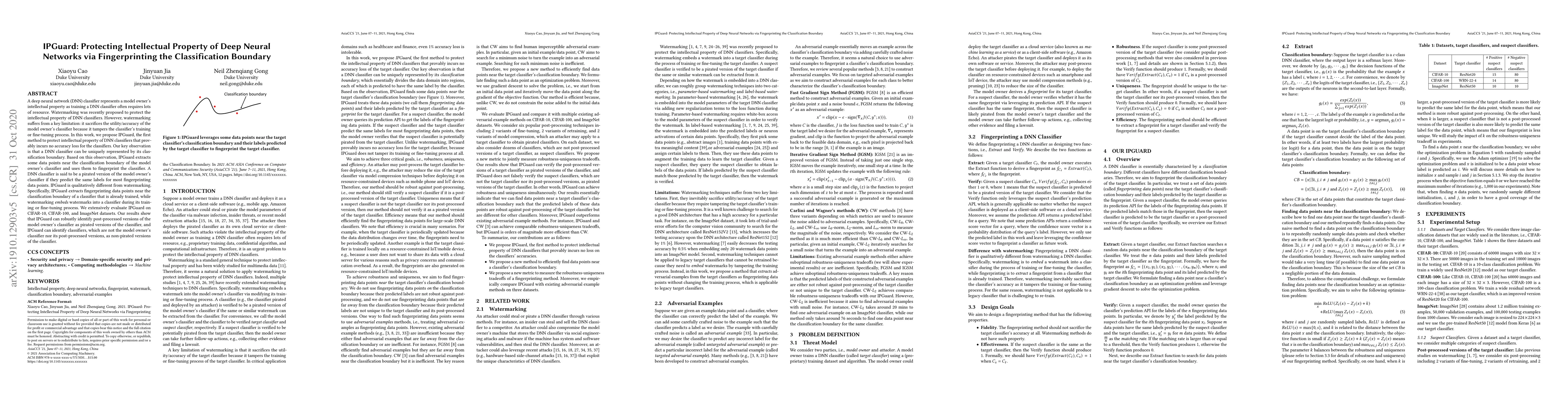 IPGuard protects the intellectual property of deep neural network classifiers by fingerprinting the classification boundary without sacrificing accuracy. Unlike watermarking, IPGuard extracts data points near the trained classifier's boundary to identify pirated versions, demonstrating robust performance across multiple datasets.