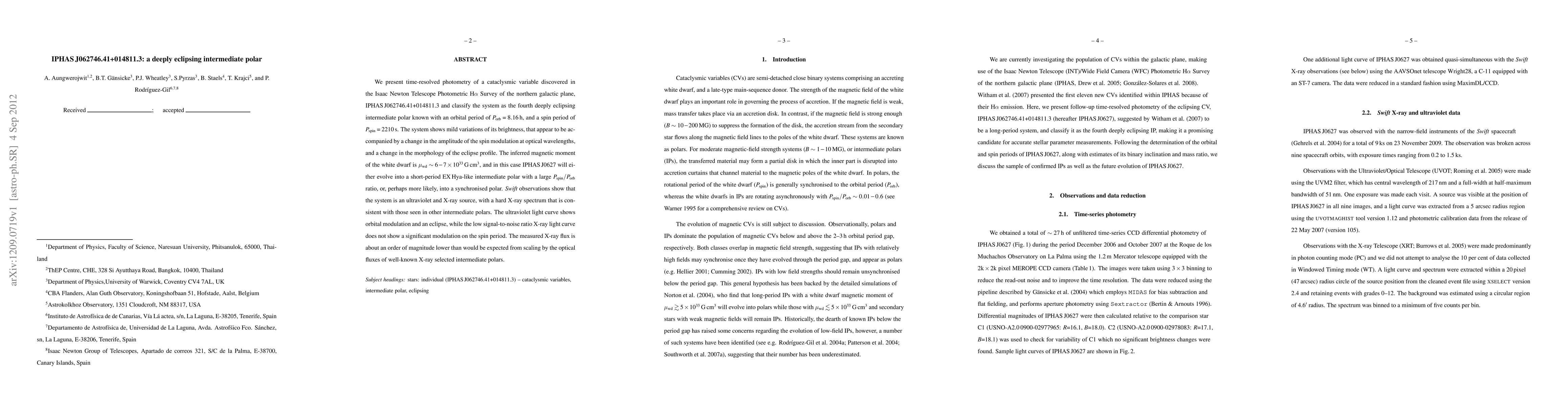 We present time-resolved photometry of a cataclysmic variable discovered in the Isaac Newton Telescope Photometric Halpha Survey of the northern galactic plane, IPHAS J062746.41+014811.3 and classify the system as the fourth deeply eclipsing intermediate polar known with an orbital period of Porb=8.16 h, and spin period of Pspin=2210 s. The system shows mild variations of its brightness, that appear to be accompanied by a change in the amplitude of the spin modulation at optical wavelengths, and a change in the morphology of the eclipse profile. The inferred magnetic moment of the white dwarf is mu_wd = 6-7 x 10^33 Gcm^3, and in this case IPHAS J0627 will either evolve into a short-period EX Hya-like intermediate polar with a large Pspin\Porb ratio, or, perhaps more likely, into a synchronised polar. Swift observations show that the system is an ultraviolet and X-ray source, with a hard X-ray spectrum that is consistent with those seen in other intermediate polars. The ultraviolet light curve shows orbital modulation and an eclipse, while the low signal-to-noise ratio X-ray light curve does not show a significant modulation on the spin period. The measured X-ray flux is about an order of magnitude lower than would be expected from scaling by the optical fluxes of well-known X-ray selected intermediate polars.