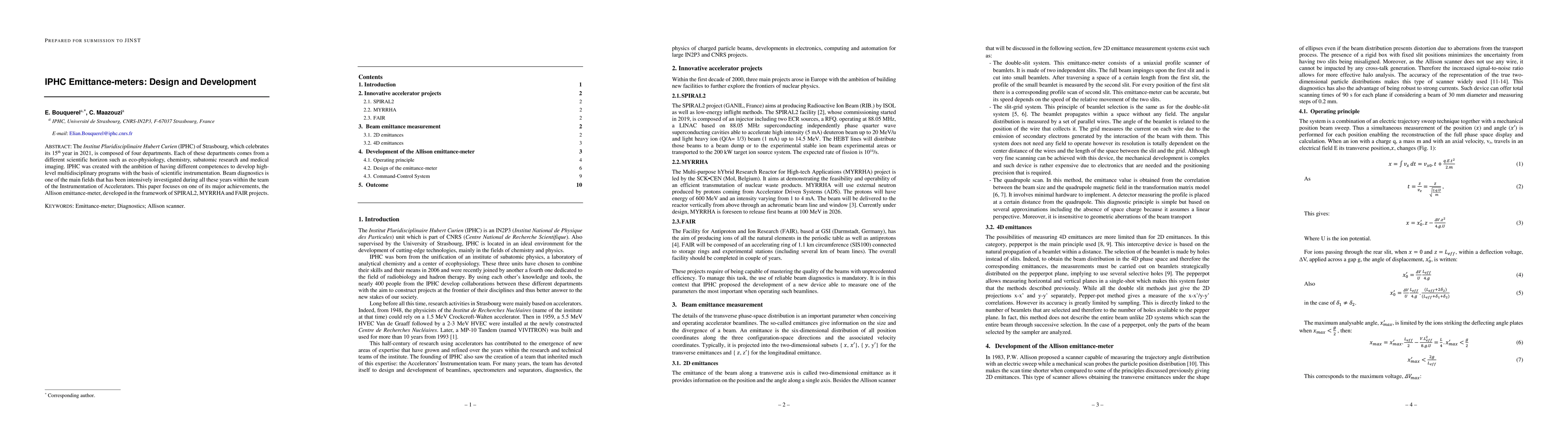 The Institut Pluridisciplinaire Hubert Curien (IPHC) of Strasbourg, which celebrates its 15th year in 2021, is composed of four departments. Each of these departments comes from a different scientific horizon such as eco-physiology, chemistry, subatomic research and medical imaging. IPHC was created with the ambition of having different competences to develop high-level multidisciplinary programs with the basis of scientific instrumentation. Beam diagnostics is one of the main fields that has been intensively investigated during all these years within the team of the Instrumentation of Accelerators. This paper focuses on one of its major achievements, the Allison emittance-meter, developed in the framework of SPIRAL2, MYRRHA and FAIR projects.