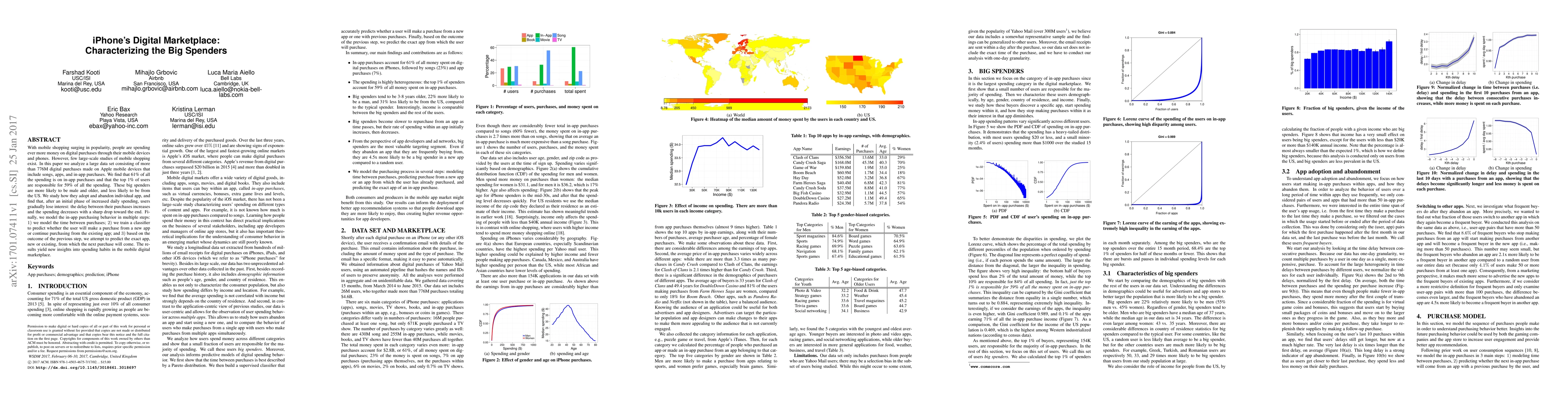 With mobile shopping surging in popularity, people are spending ever more money on digital purchases through their mobile devices and phones. However, few large-scale studies of mobile shopping exist. In this paper we analyze a large data set consisting of more than 776M digital purchases made on Apple mobile devices that include songs, apps, and in-app purchases. We find that 61% of all the spending is on in-app purchases and that the top 1% of users are responsible for 59% of all the spending. These big spenders are more likely to be male and older, and less likely to be from the US. We study how they adopt and abandon individual app, and find that, after an initial phase of increased daily spending, users gradually lose interest: the delay between their purchases increases and the spending decreases with a sharp drop toward the end. Finally, we model the in-app purchasing behavior in multiple steps: 1) we model the time between purchases; 2) we train a classifier to predict whether the user will make a purchase from a new app or continue purchasing from the existing app; and 3) based on the outcome of the previous step, we attempt to predict the exact app, new or existing, from which the next purchase will come. The results yield new insights into spending habits in the mobile digital marketplace.