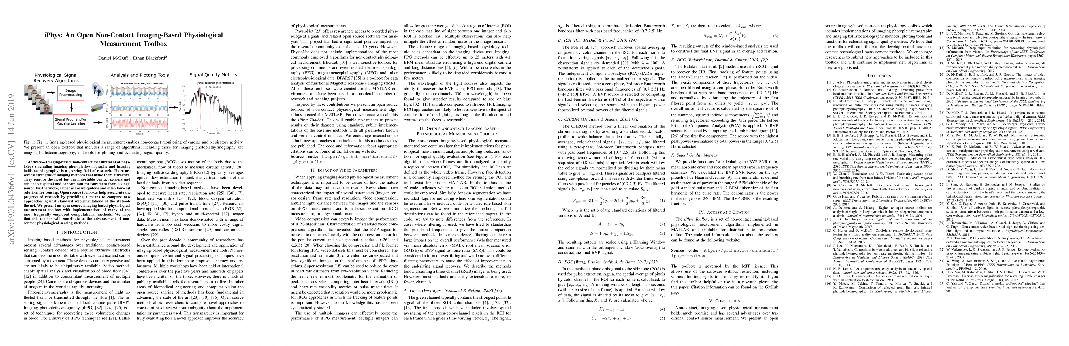The paper introduces iPhys, an open-source toolbox for non-contact imaging-based physiological measurements, including imaging photoplethysmography and imaging ballistocardiography. The toolbox aims to advance research by providing accessible, low-cost, and comparative implementations of state-of-the-art computational methods.