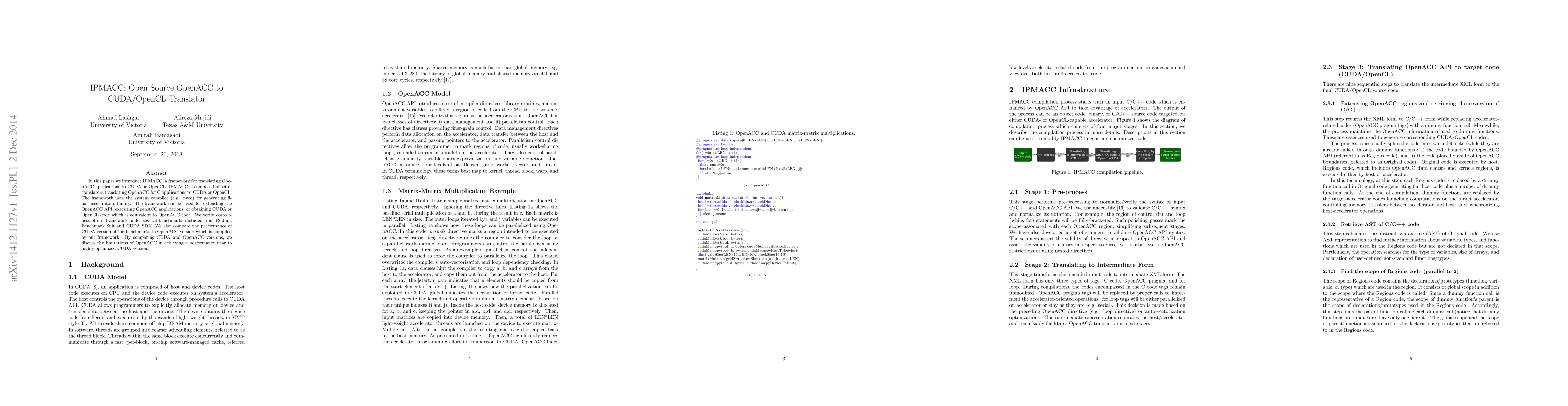 Summary: IPMACC is an open-source framework translating OpenACC applications to CUDA or OpenCL, utilizing system compilers for final binary generation. The framework's correctness and performance are validated against benchmarks, revealing OpenACC's limitations in achieving CUDA's optimized performance.