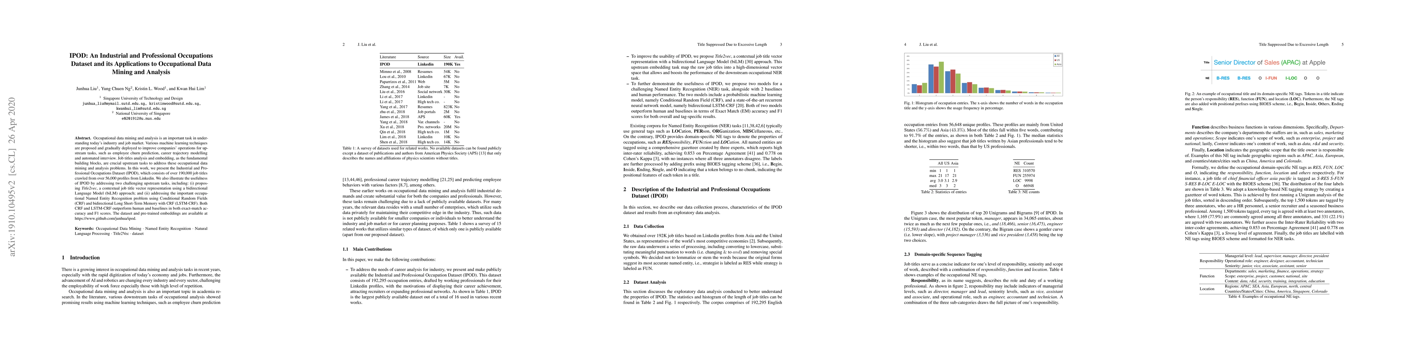The paper presents the Industrial and Professional Occupations Dataset (IPOD) comprising over 190,000 job titles from LinkedIn profiles, aimed at enhancing occupational data mining. It demonstrates the dataset's utility through two tasks: Title2vec for contextual job title representation and CRF and LSTM-CRF for occupational Named Entity Recognition, both outperforming baselines.