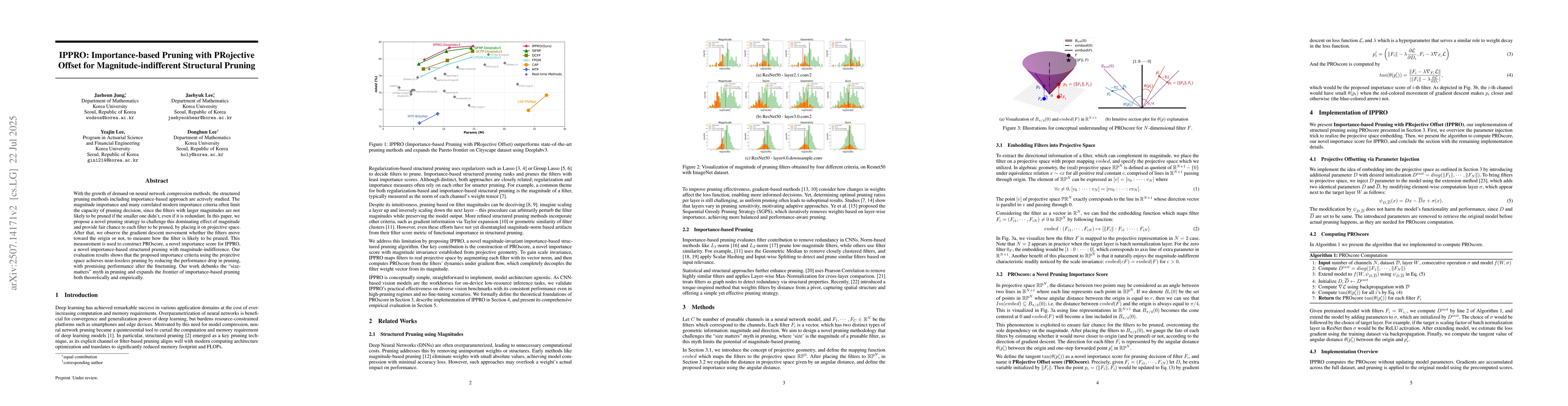 With the growth of demand on neural network compression methods, the structured pruning methods including importance-based approach are actively studied. The magnitude importance and many correlated modern importance criteria often limit the capacity of pruning decision, since the filters with larger magnitudes are not likely to be pruned if the smaller one didn't, even if it is redundant. In this paper, we propose a novel pruning strategy to challenge this dominating effect of magnitude and provide fair chance to each filter to be pruned, by placing it on projective space. After that, we observe the gradient descent movement whether the filters move toward the origin or not, to measure how the filter is likely to be pruned. This measurement is used to construct PROscore, a novel importance score for IPPRO, a novel importance-based structured pruning with magnitude-indifference. Our evaluation results shows that the proposed importance criteria using the projective space achieves near-lossless pruning by reducing the performance drop in pruning, with promising performance after the finetuning. Our work debunks the ``size-matters'' myth in pruning and expands the frontier of importance-based pruning both theoretically and empirically.