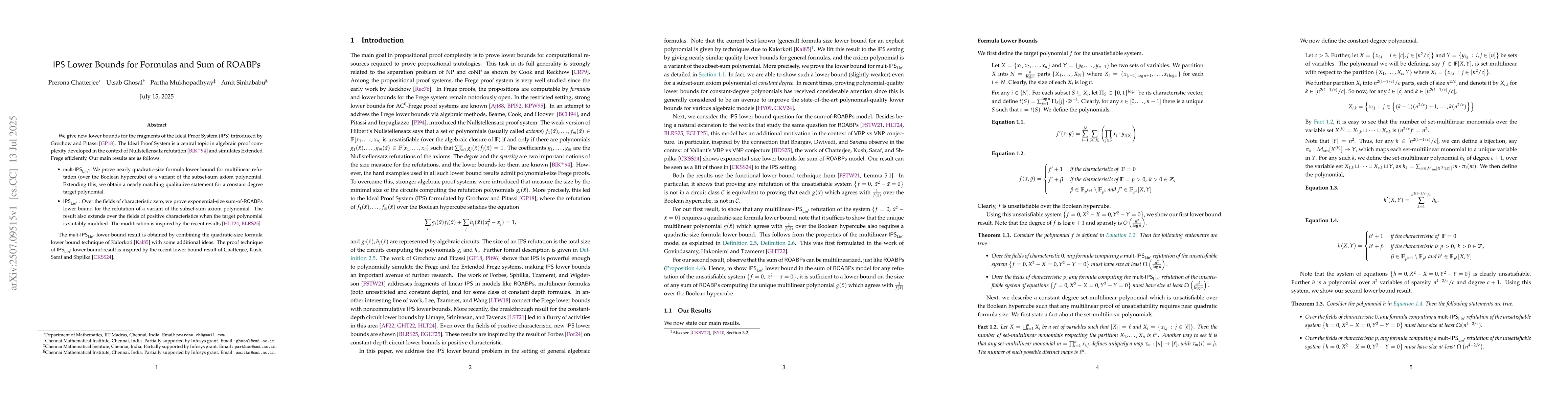 We give new lower bounds for the fragments of the Ideal Proof System (IPS) introduced by Grochow and Pitassi (JACM 2018). The Ideal Proof System is a central topic in algebraic proof complexity developed in the context of Nullstellensatz refutation (Beame, Impagliazzo, Krajicek, Pitassi, Pudlak, FOCS 1994) and simulates Extended Frege efficiently. Our main results are as follows. 1. mult-IPS_{Lin'}: We prove nearly quadratic-size formula lower bound for multilinear refutation (over the Boolean hypercube) of a variant of the subset-sum axiom polynomial. Extending this, we obtain a nearly matching qualitative statement for a constant degree target polynomial. 2. IPS_{Lin'}: Over the fields of characteristic zero, we prove exponential-size sum-of-ROABPs lower bound for the refutation of a variant of the subset-sum axiom polynomial. The result also extends over the fields of positive characteristics when the target polynomial is suitably modified. The modification is inspired by the recent results (Hakoniemi, Limaye, Tzameret, STOC 2024 and Behera, Limaye, Ramanathan, Srinivasan, ICALP 2025). The mult-IPS_{Lin'} lower bound result is obtained by combining the quadratic-size formula lower bound technique of Kalorkoti (SICOMP 1985) with some additional ideas. The proof technique of IPS_{Lin'} lower bound result is inspired by the recent lower bound result of Chatterjee, Kush, Saraf and Shpilka (CCC 2024).