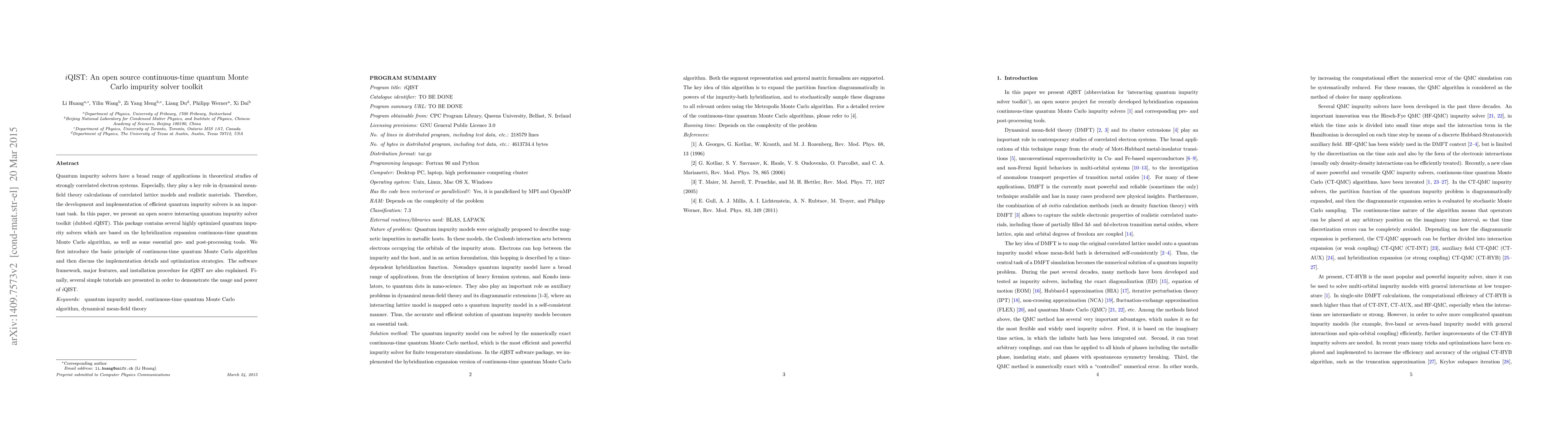 This paper introduces $i$QIST, an open-source toolkit for continuous-time quantum Monte Carlo impurity solvers, essential for studying strongly correlated electron systems. The toolkit includes optimized solvers and pre/post-processing tools, with detailed implementation and optimization strategies.