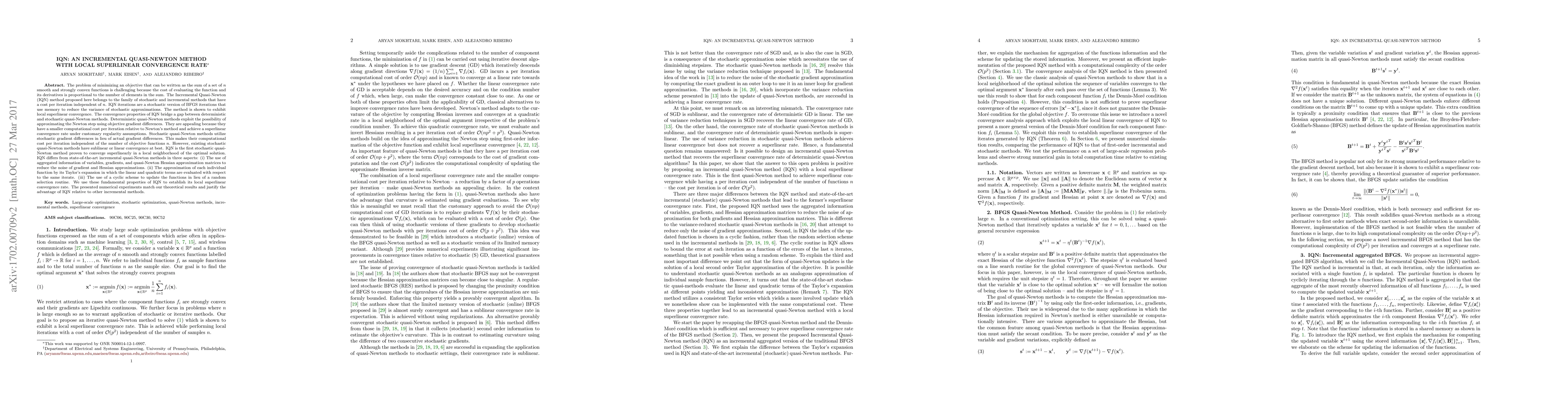 The Incremental Quasi-Newton (IQN) method is a novel stochastic optimization technique that achieves superlinear convergence in local neighborhoods of optimal solutions. It bridges the gap between deterministic and stochastic quasi-Newton methods by leveraging aggregated information and a cyclic scheme for function updates.