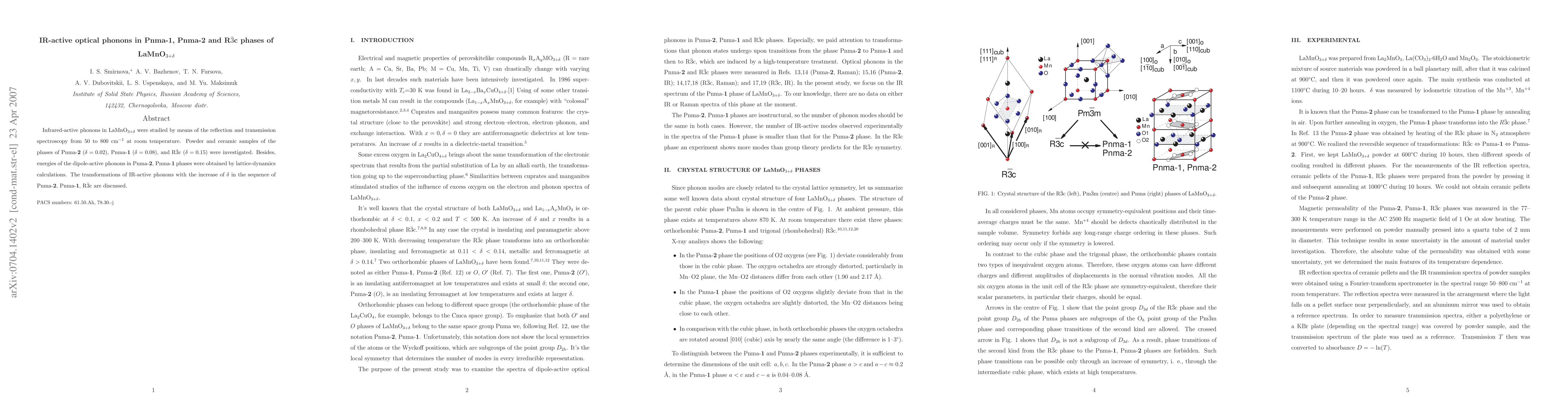 Infrared-active phonons in LaMnO_{3+\delta} were studied by means of the reflection and transmission spectroscopy from 50 to 800 cm^{-1} at room temperature. Powder and ceramic samples of the phases of Pnma-2 (\delta=0.02), Pnma-1 (\delta=0.08), and R3c (\delta=0.15) were investigated. Besides, energies of the dipole-active phonons in Pnma-2, Pnma-1 phases were obtained by lattice-dynamics calculations. The transformations of IR-active phonons with the increase of \delta in the sequence of Pnma-2, Pnma-1, R3c are discussed.